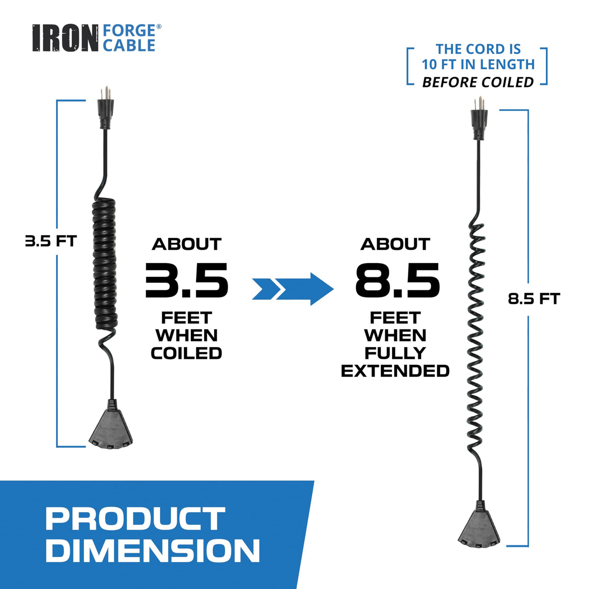 Q: How does the coiled design of this extension cord benefit users?A: The coiled design of the Iron Forge Cable Extension Cord offers significant benefits, including easy extension and hassle-free retraction, which reduces tangles during use and storage. This feature enhances portability and convenience, allowing users to quickly set up or pack away the cord.