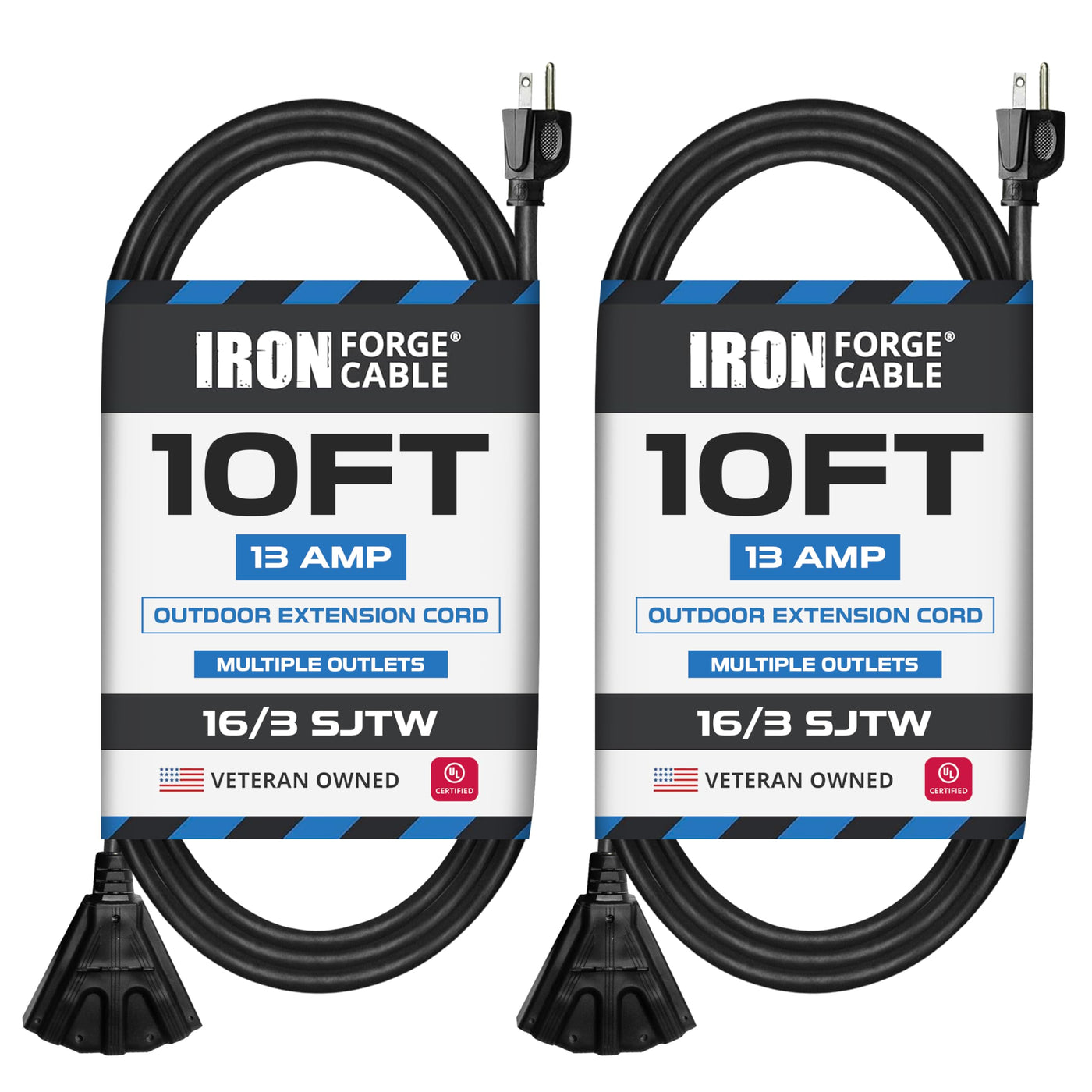 Iron Forge Cable 3 Outlet Outdoor Extension Cord 10 Ft, 2 Pack, 16/3 Sjtw Black Extension Cord With Multiple Outlets 3 Prong, 13
