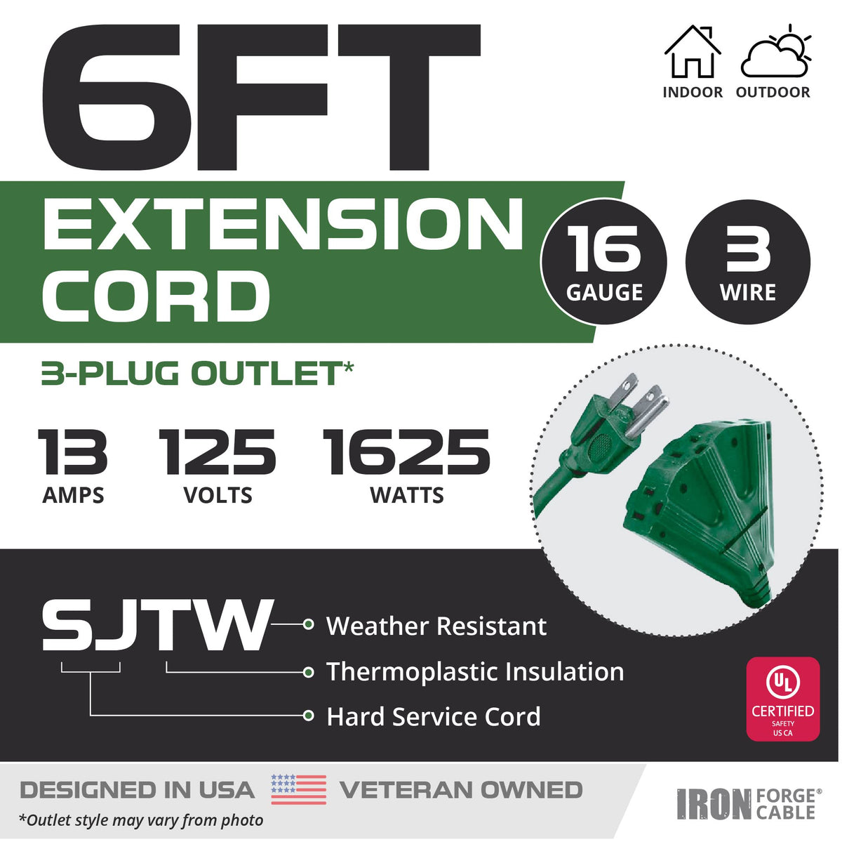 Blends Into Landscaping - This Dark Green Outdoor Extension Cord 6 Foot Blends Perfectly Into Your Exterior Landscape And Is Designed For Outdoor Use. Great For Outdoor Light Decorations, As Well As Household Appliance, Leaf Blower, Lawnmower, Landscaping, Gardening, And Much More. Perfect For Powering Multiple Devices At Once.3 Outlets In 1: This Outdoor 3 Way Outlet Extension Cord 6Ft Allows You To Simultaneously Power Multiple Tools Or Devices. Perfect For Safely Powering Multiple Indoor & Outdoor Lights Decoration.Weatherproof & Heavy Duty: This 100Green Extension Cord For Outside Is Weatherproof With A Durable Vinyl Jacket That Protects Cord Against Water, Snow, Sunlight, Corrosion, & Bending, Remaining Tangle-Free. Reinforced Blades: The Nickel-Coated Protects Prongs From Bending Or Breaking, And Help Secure The Plug Firmly In Place. This Ensures That The Cord Functions Well, Stays In Place, And Remains In Good Condition, And Helps This Cord Last You For Years.Ul Certified - 16 Gauge/16 Awg Extension Cord, 3 Outlet Pigtail, 3 Wire Grounded Plug, 6 Foot, 13 Amp, 125 Volt, 1625 Watt. Temperature Range: -40?F To +140?F.100% Satisfaction Guaranteed: Us Veteran Owned - Iron Forge Cable, A U.S. Veteran-Owned Business, Stands Behind Its Extension Cords. If Any Issues Arise, A Replacement Will Be Given.