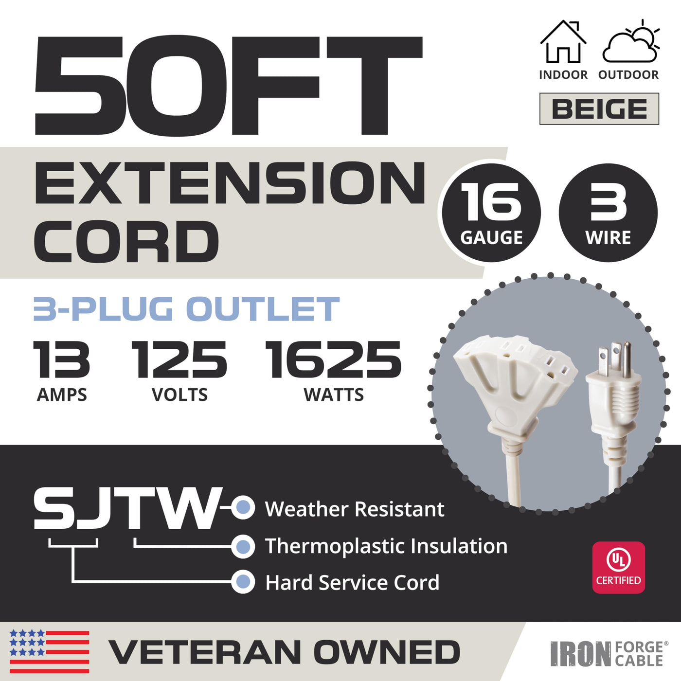 Iron Forge Cable 50 Ft Beige Outdoor Extension Cord With 3 Outlets 16/3 Sjtw 50Ft Extension Cord 3 Prong, 13 Amp All Weather H
