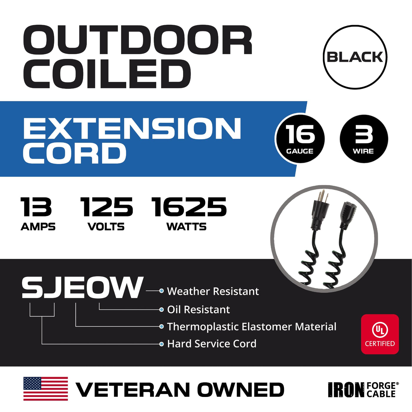 Iron Forge Cable 50Ft Black Coiled Outdoor Extension Cord 16/3 Sjeow Oil Resistant & Flame Retardant 3 Prong 13 Amp Power Cord