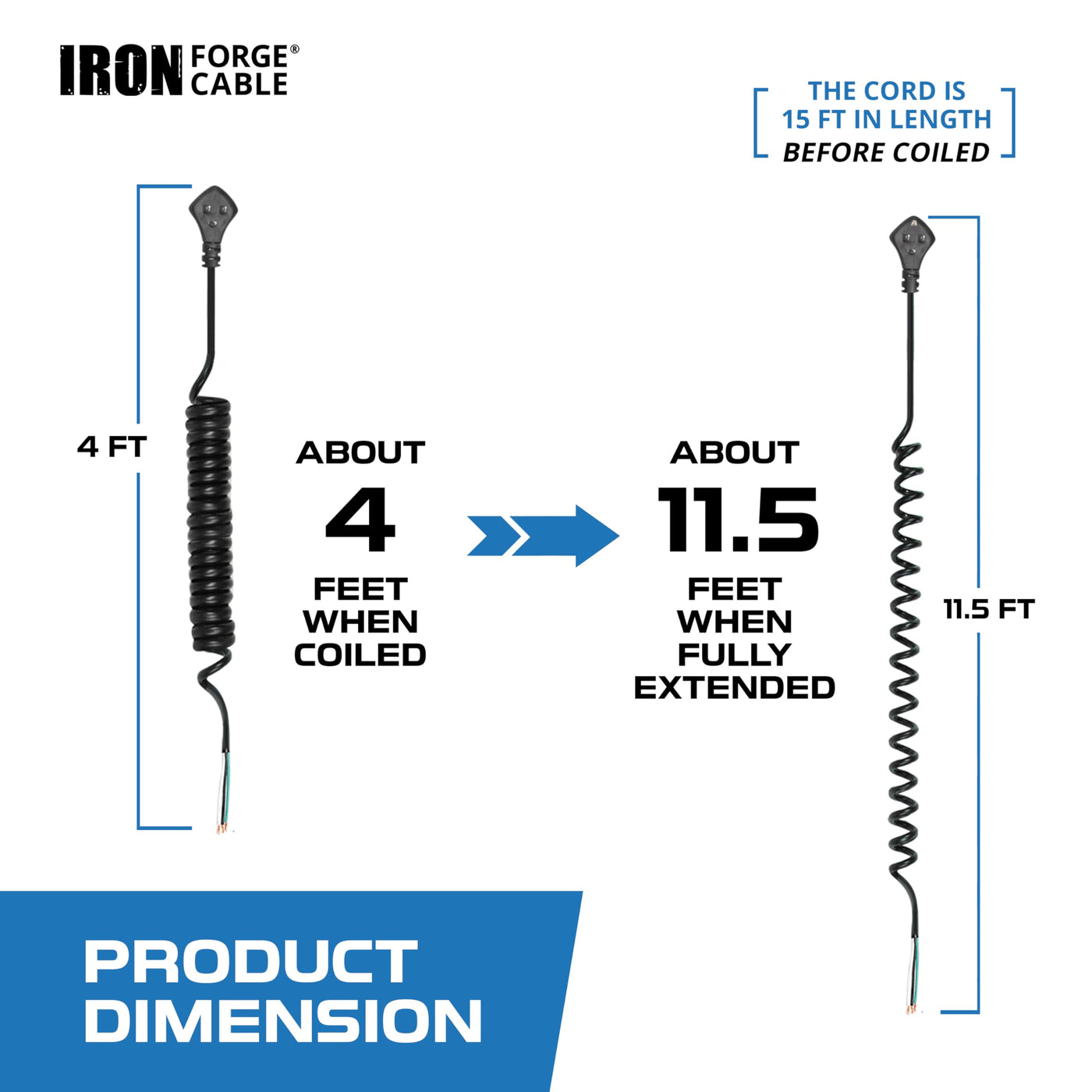 Q: What is the length of the Iron Forge Cable Coiled Extension Cord when fully extended?A: The Iron Forge Cable Coiled Extension Cord extends to 11.5 feet, providing ample reach for various indoor and outdoor applications.