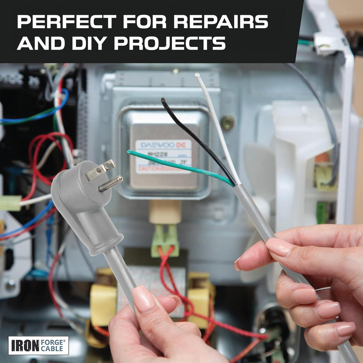Q: What is the gauge and length of this replacement power cord?A: The Iron Forge Cable Flat Plug Replacement Power Cable is a 12 AWG cord with a length of 15 feet, providing ample reach for your appliance connections.