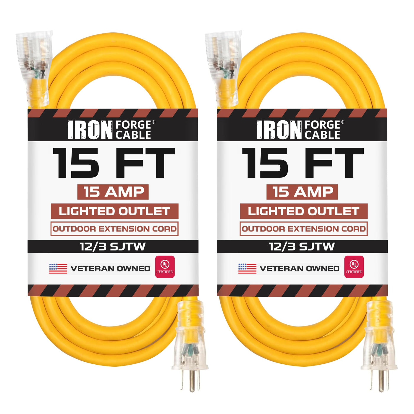 Iron Forge Cable Lighted Outdoor Extension Cord 15 Ft 2 Pack 12 Gauge 15 Amp Heavy Duty Power Extension Cords Sjtw Great F
