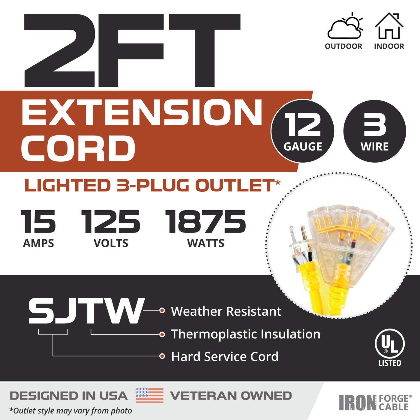 Extra Heavy Duty Extension Cord: This Iron Forge Cable Extension Cord Is Rated For Heavy Duty All Purpose Work And For Rugged Use, Suitable For Indoor And Outdoor. Great For Powering Major Appliances, Lawn Mower, Gardens, Power Tools, Welder, Air Conditioner, Saw, Grinder, Space Heater, Generator, Construction Work, Hvac, And Much More.Weatherproof & Flame Retardant: Our High Flexibility Vinyl Covering Is More Resistant To Bending And Won'T Break When Moved, Bent, Or Pulled For An Extended Period Of Time. Our Superior Grade Extension Cable Can Be Used In Extreme Weather Thanks To Our High Quality Covering Material That Protects Cords Against Moisture, Water, Snow, Abrasion, And Sunlight Even After Long Hours Of Use. Easy To Unfold For Extra Convenience And Flexible In Cold Weather.3 Outlets In 1: Multiple Outlets Extension Cord For Simultaneous Multiple Use. Reinforced Blades: The Nickel-Coated Protects Prongs Of This 2' Heavy Duty Extension Cable With Multiple Plugs From Bending Or Breaking, And Help Secure The Plug Firmly In Place. This Ensures That The Cord Functions Well, Stays In Place, And Remains In Good Condition, And Helps This Cord Last You For Years.Ul Certified: 12 Gauge Heavy Duty 2 Pack Of 2 Foot Yellow Power Cord, 3 Outletin Pigtail, Powerblock 3-Way Style, 13 Amp, 125 Volt, 1875 Watt, 5-15P/R, Ul Certified. Temperature Range: -40?F To +140?F100% Satisfaction Guaranteed: Us Veteran Owned - Iron Forge Cable, A U.S. Veteran-Owned Business, Stands Behind Its Extension Cords. If Any Issues Arise, A Replacement Will Be Given.