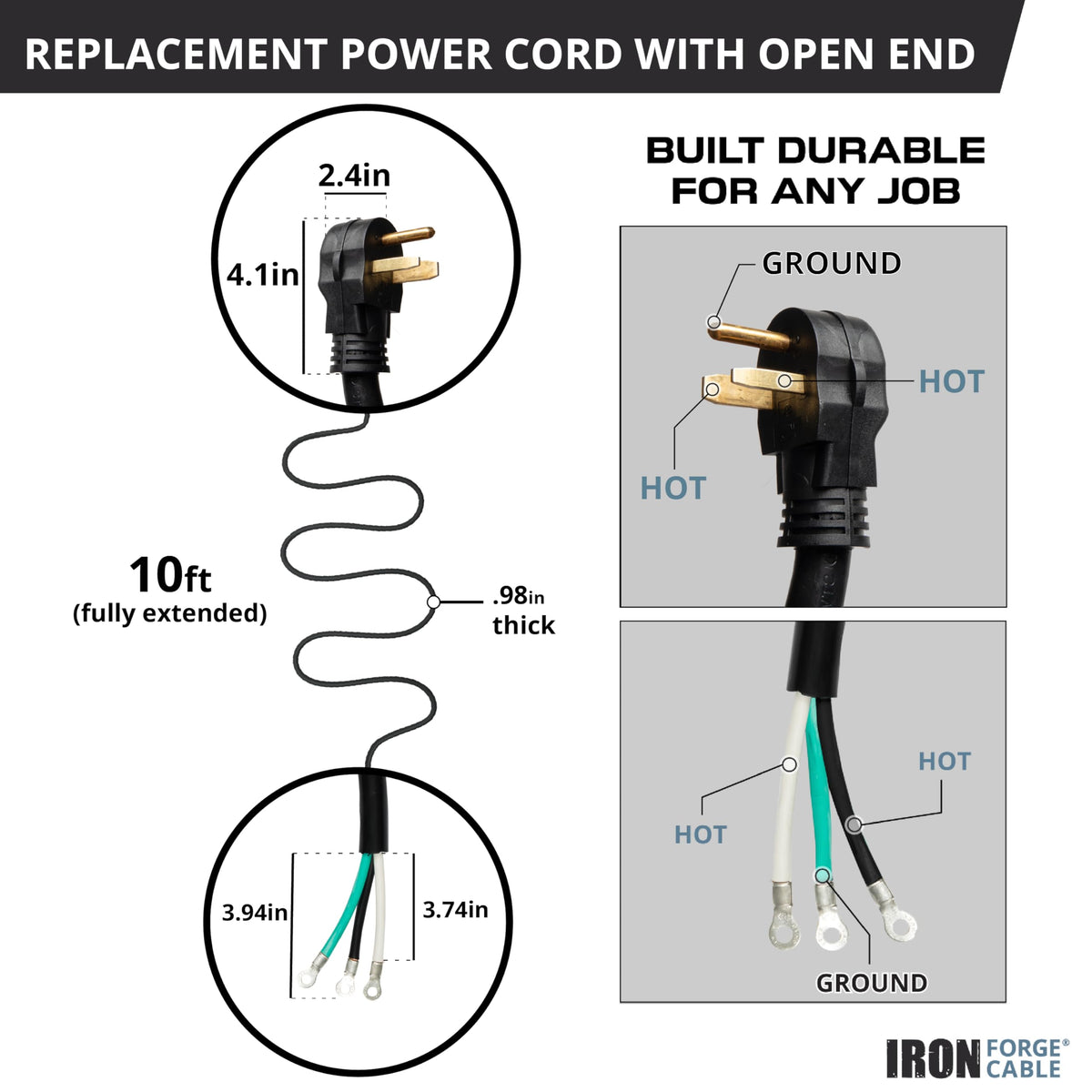 Iron Forge Cable Nema Ev Extension Cord 10 Ft With Open End, 50 Amp Power Cord With Eyelet 3 Wire 6/3 Gauge Replacement Cable, N