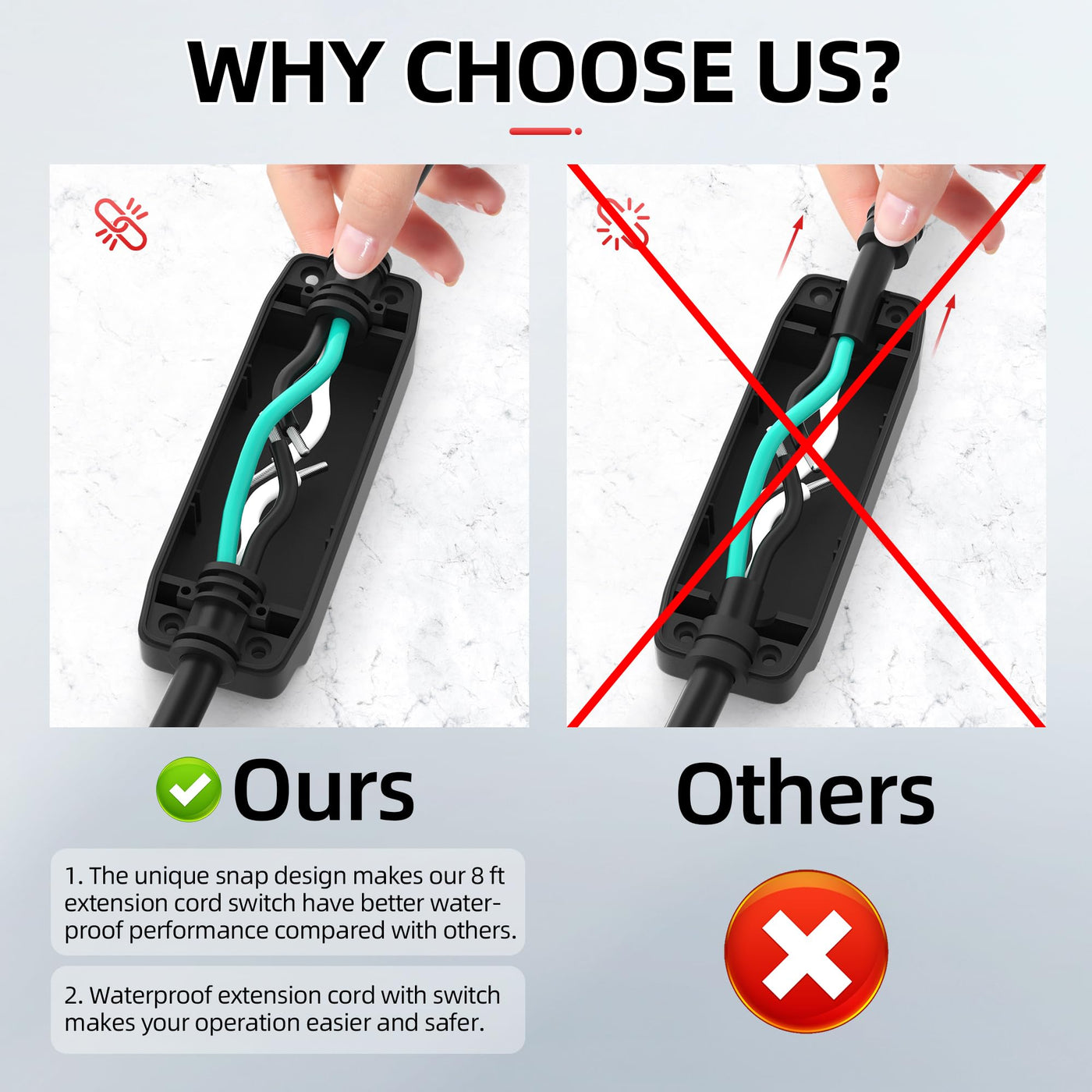 Q: How easy is it to operate the inline switch on this extension cord?A: Operating the inline switch is very simple; just plug the cord into the socket and connect your appliance to the other end. The on/off waterproof LED switch allows for easy control of your devices.
