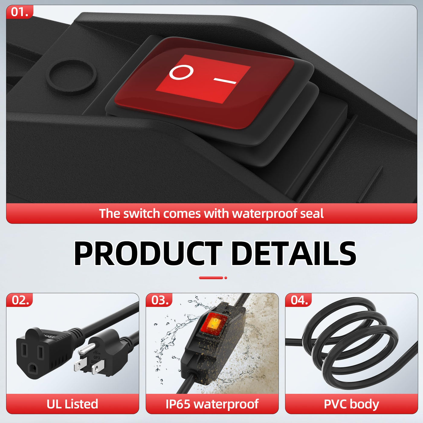 Specifications: Length: 8Ft / Wire: 14Awg Cord Type: Sjtw Rated Current: 15A Rated Voltage: 125V Rated Power: 1875W Features: Waterproof Inline Switch: Each 3 Prong Extension Cord Comes With An On Off Waterproof Led Inline Cord Switch, So You Can Use It Indoors Or Outdoors, Which Makes It More Safe And Convenient To Use. Rated Current: 15A; Rated Voltage: 125V. Heavy Duty Cable: This Outdoor 3 Prong Extension Cord With Switch Is Made Of Pvc, Which Features Heat Resisting And Fire Prevention. Compared With The Traditional 16Awg Extension Cord, We Are Rated At 1875W, There Are Three 14Awg Copper Wires Inside That Can Withstand The Current Strength Of 15 Amps, Which Can Make Your Current Safer And More Stable. Ul Listed: All Product Components Are Ul Certified, Which Makes Your Installation And Use More Security And Reliable, High Quality Features Your Electricity Safety. You Just Need To Plug The Plug Into The Socket And Plug In The Appliance You Want At The Other End To Operate, It Is Super Easy To Operate.
