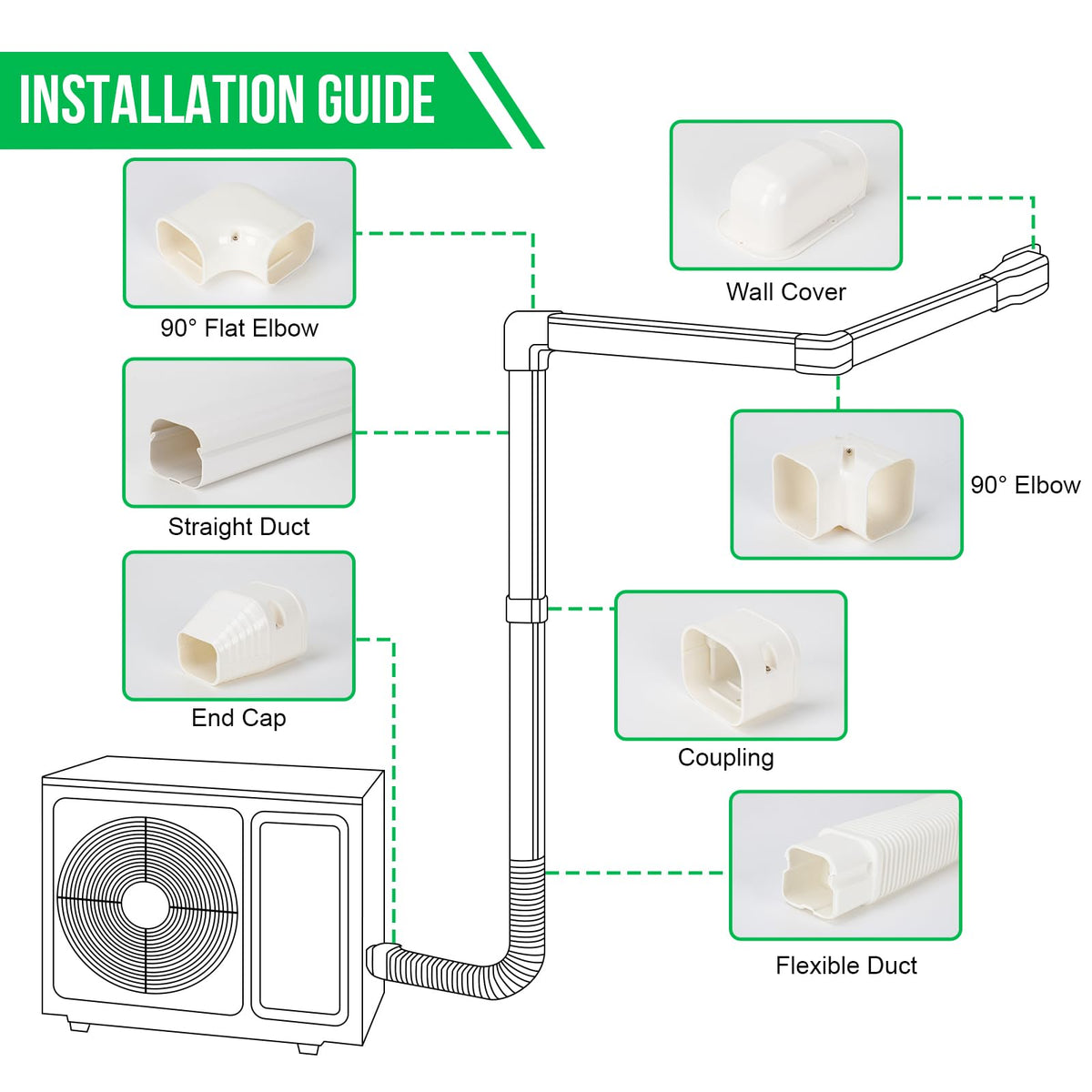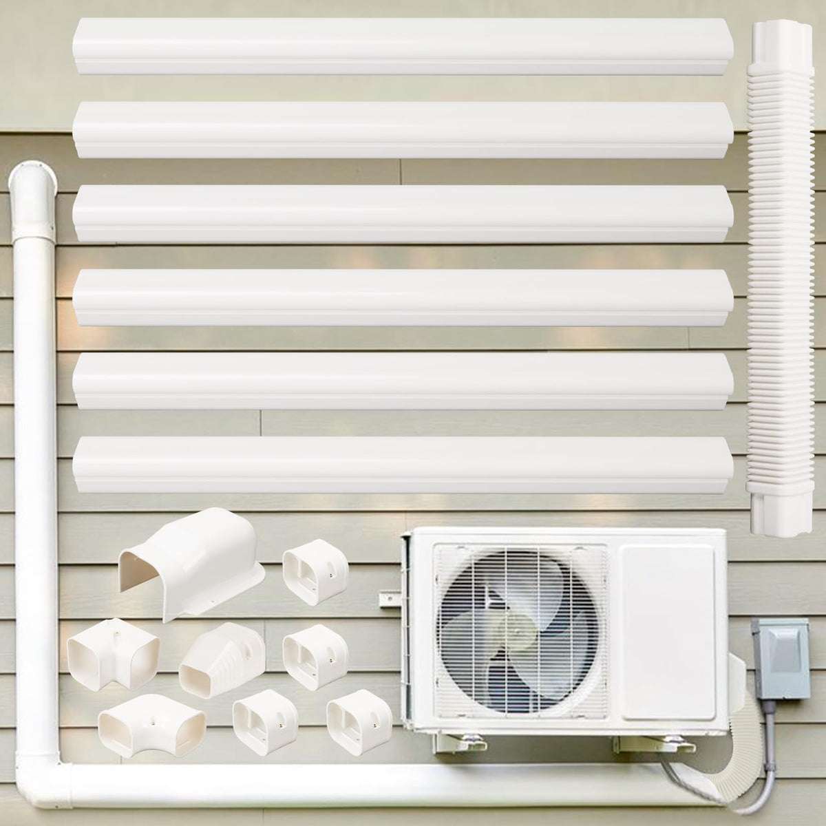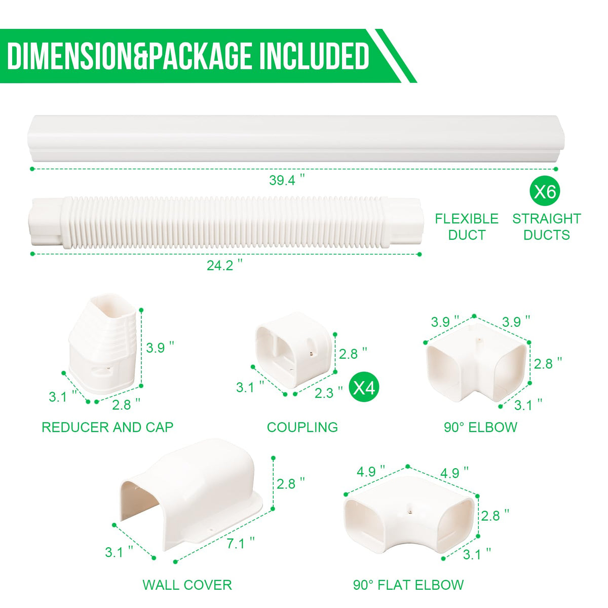 Q: What does the Kerykwan Mini Split AC Line Cover Kit include?A: The Kerykwan Mini Split AC Line Cover Kit comes with a complete set including 6 straight ducts measuring 3 inches wide and 39.3 inches long, 4 couplings, 2 types of 90° flat elbows, a wall cover, a flexible duct, and a reducer end cap.