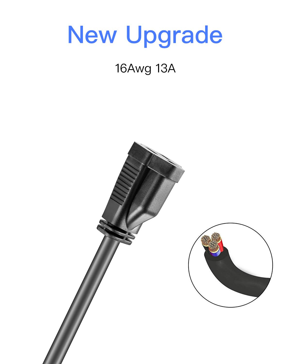 Q: What is the wire gauge of the KMC Power Extension Cord, and why is it important?A: The KMC Power Extension Cord features a 16 AWG wire gauge, which allows it to handle more amperage and wattage safely compared to thinner cords, reducing the risk of overheating.