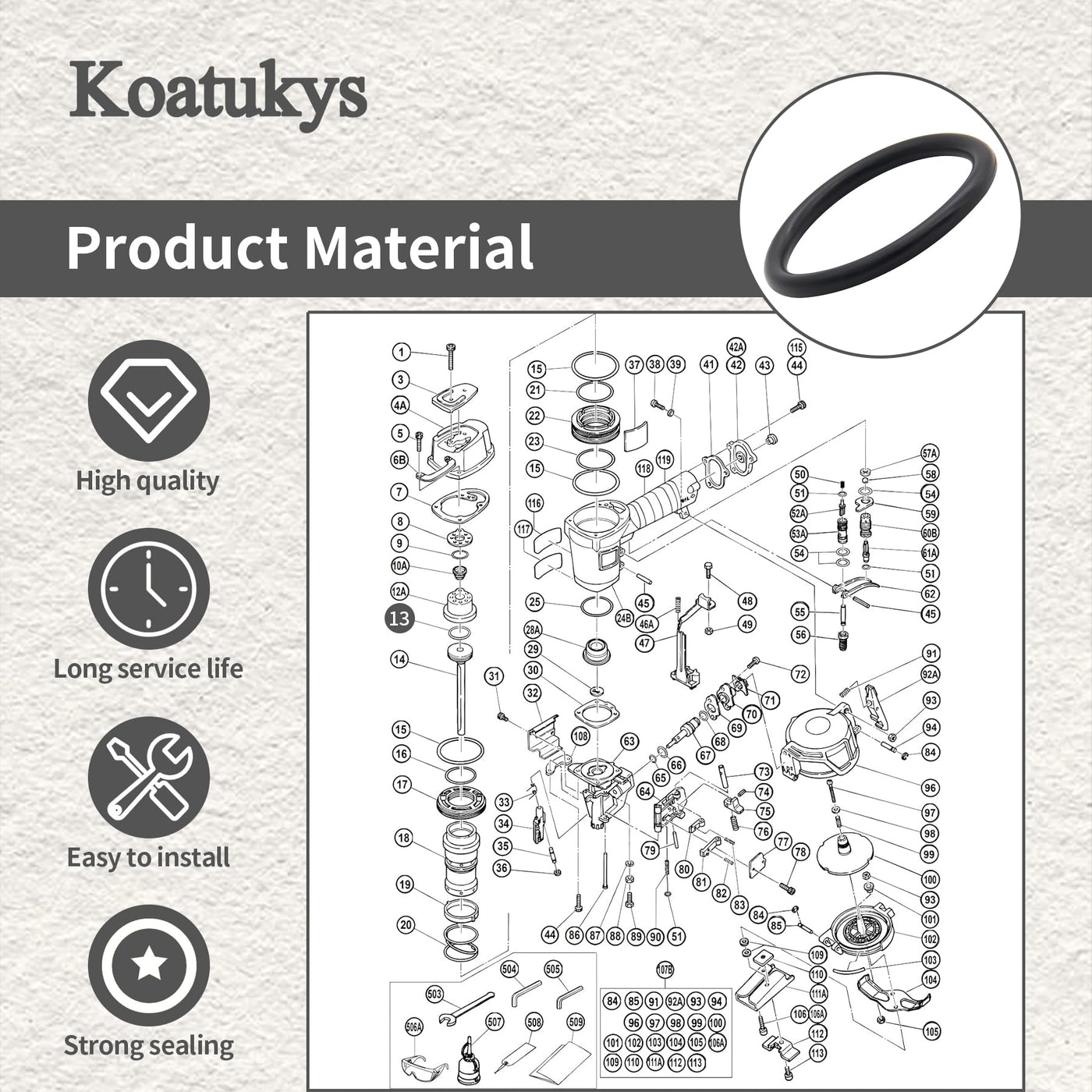 Q: What material are the Koatukys piston O-rings made from?A: The Koatukys piston O-rings are made from durable rubber, which is designed to withstand wear and tear from regular use in nailers.