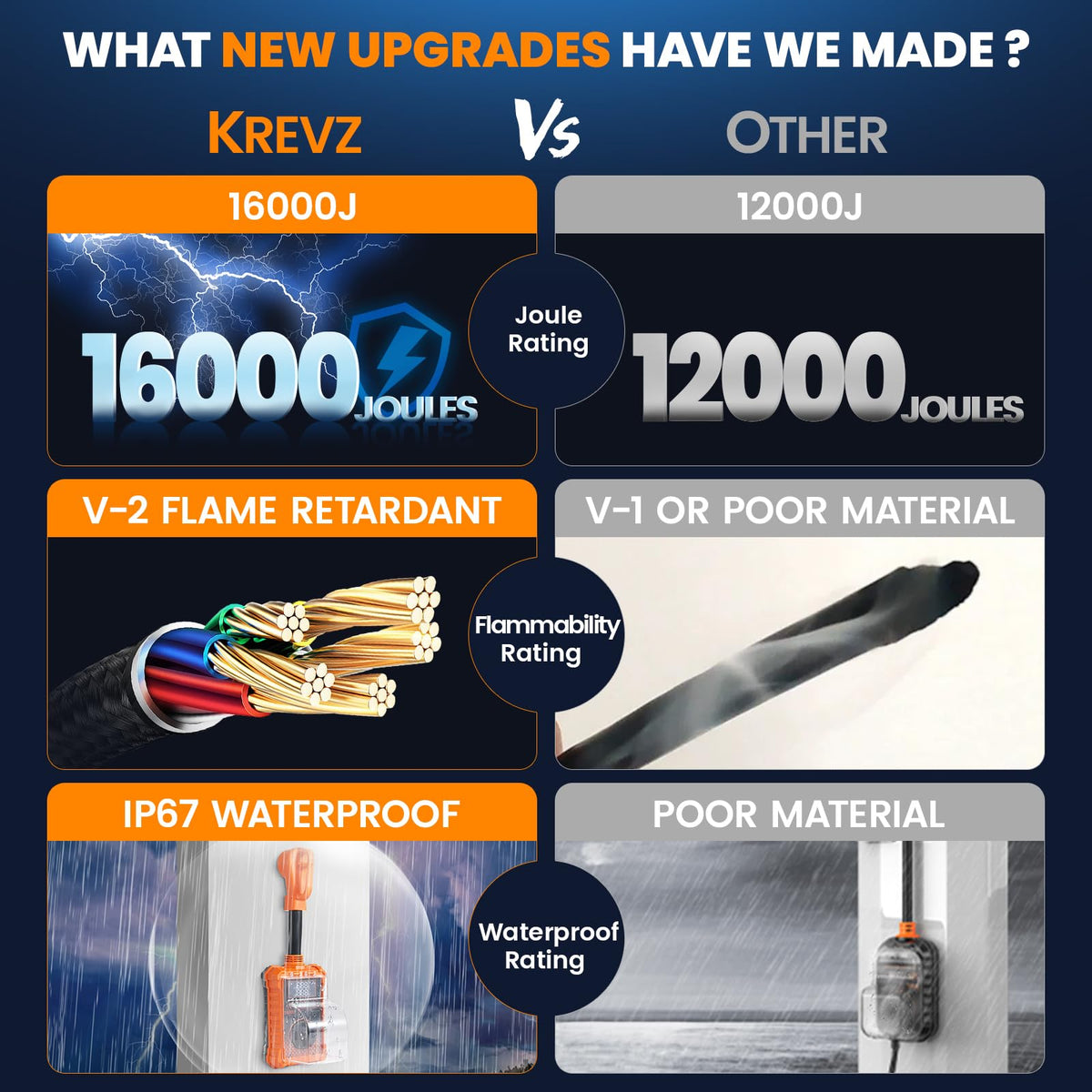 Q: What is the surge protection rating of the Krevz 16000 J RV Surge Protector?A: The Krevz 16000 J RV Surge Protector offers a surge protection rating of 16,000 joules, which provides at least 30% more protection compared to standard 12,000 joule models. This high rating helps absorb lightning spikes and protects your RV's electrical system, especially during harsh weather.