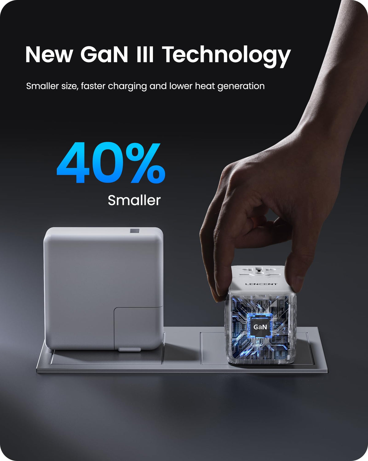Q: What makes the LENCENT travel adapter different from other chargers?A: The LENCENT travel adapter stands out due to its advanced GaN III technology, which makes it compact, efficient, and capable of faster charging while generating less heat compared to traditional chargers, along with a comprehensive safety system.