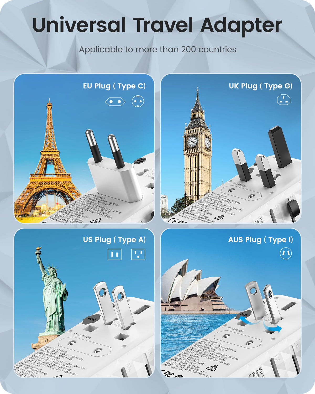 Q: What countries does the LENCENT 100W International Travel Adapter work in?A: The LENCENT 100W International Travel Adapter is compatible with over 200 countries, including regions using Type C plugs (most of Europe), Type G plugs (UK and Ireland), Type I plugs (Australia and China), and Type A plugs (USA and Japan).