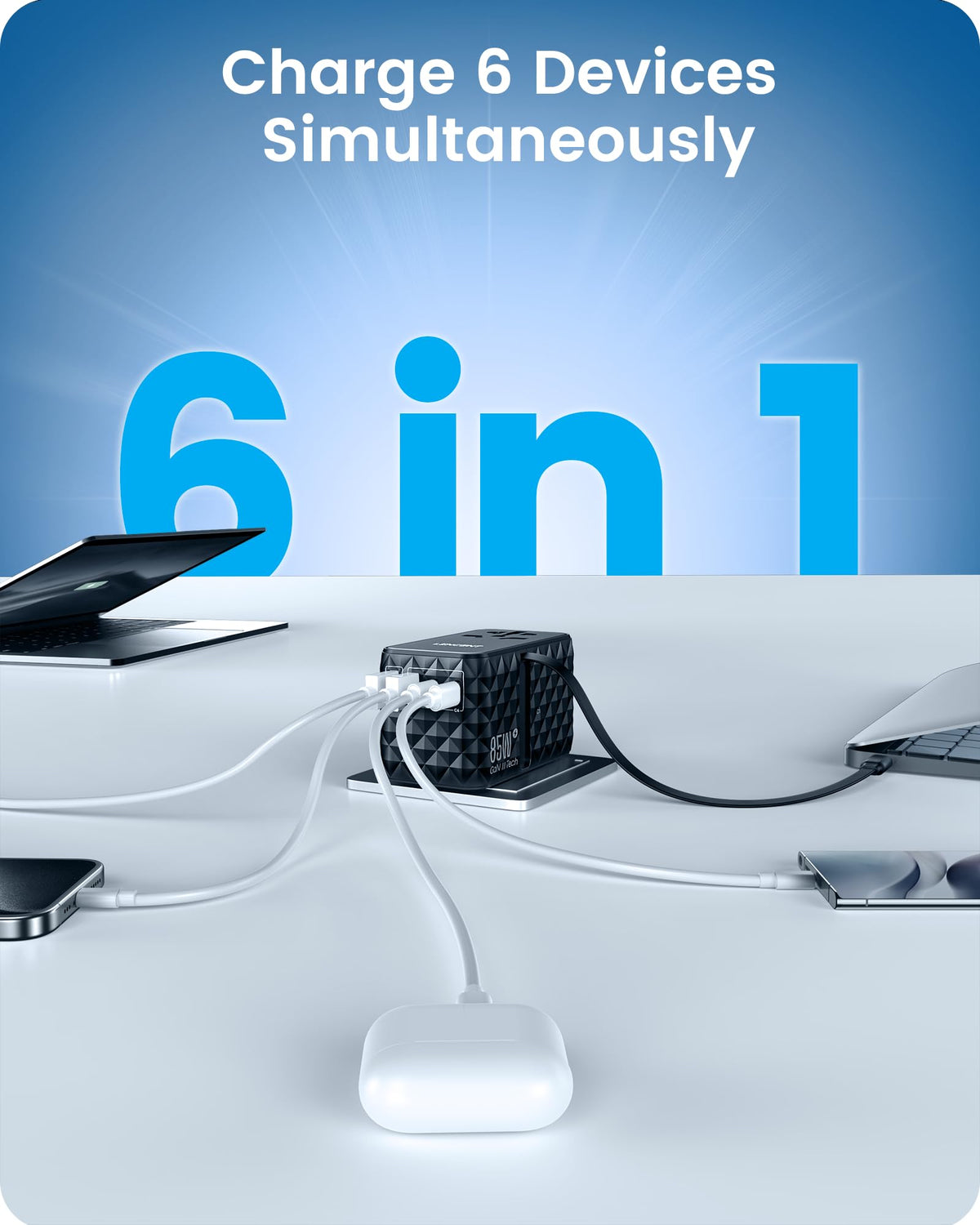 Q: What types of devices can I charge with the LENCENT 85W Universal Travel Power Adapter?A: The LENCENT 85W Universal Travel Power Adapter can charge multiple devices simultaneously, including smartphones, tablets, laptops, and other USB-powered devices. It features one USB-A port and three USB-C ports, allowing you to charge up to six devices at once.