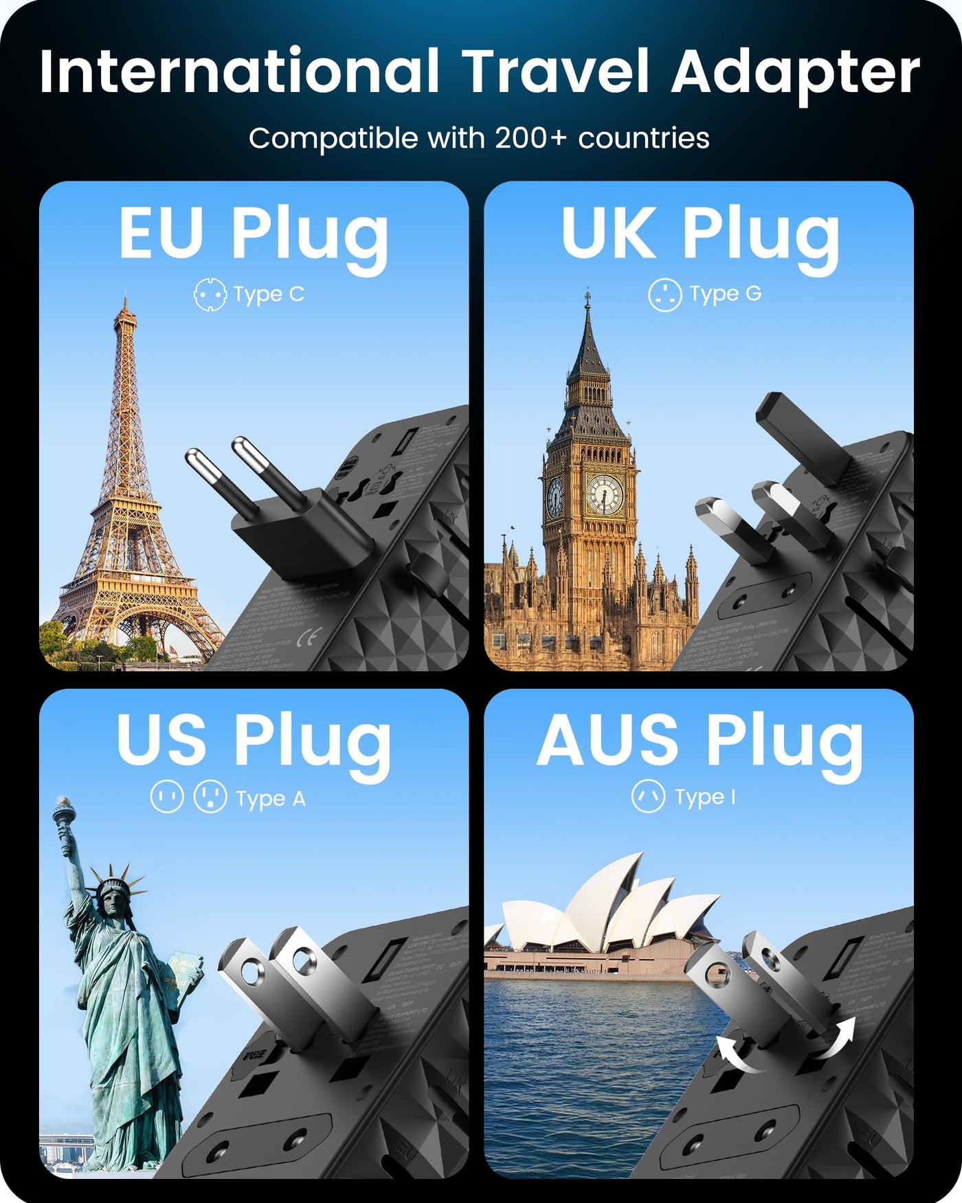 Q: Is the LENCENT travel adapter compatible with different plug types around the world?A: Yes, the LENCENT travel adapter is designed to work in over 200 countries. It supports various plug types, including Type A (USA), Type C (EU), Type G (UK), and Type I (Australia), making it an ideal choice for international travel.