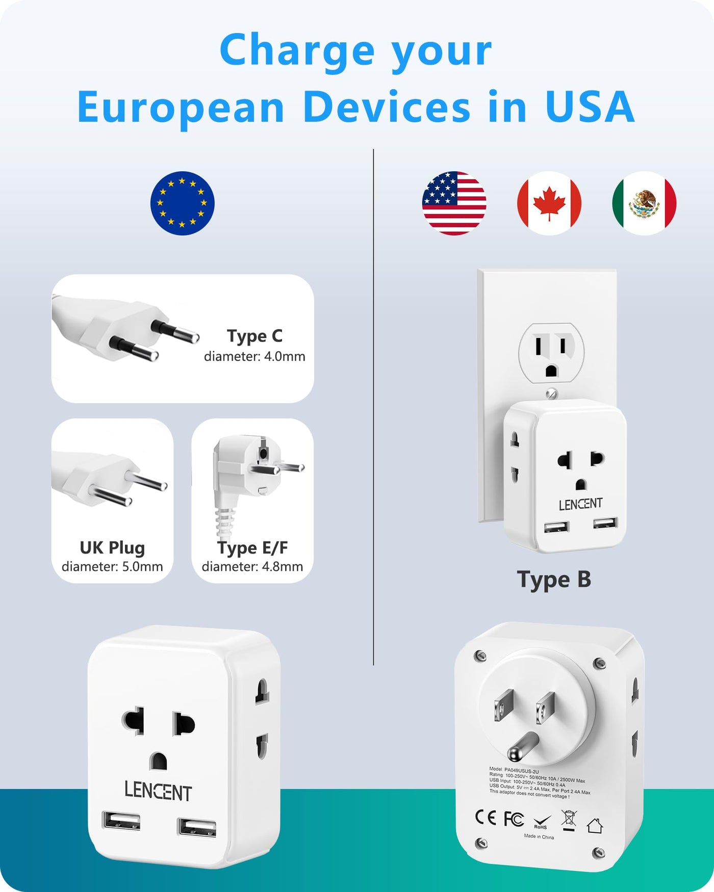 With The Lencent Eu To Us Improved Plug Adapter, You Can Charge Your European Devices, Such As Laptops, Smartphones, Hair Dryers, Straighteners, Curlers, Toothbrushes, Curling Irons, And Many Others. With Our Travel Plug Converter, You Can Use Your Devices From European Countries In The Usa. It Is Used To Connect Type C/E/F Plugs From Europe (Belgium, Finland, France, Germany, Greece, The Netherlands, Norway, Poland, Portugal, Spain, Sweden, And Other Countries) To American Wall Outlets. This Adapter Has 3 Ac Outlets On Its Sides And Can Simultaneously Charge Up To 3 Devices With A Maximum Capacity Of 2500W (250V Max, 10A). Also, It Has A Mini Charger Box And Is Cruise Ship-Approved.