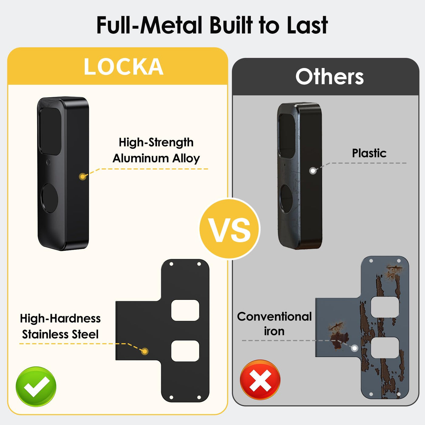 Q: How does the anti-theft feature work on the LOCKA mount?A: The LOCKA mount is made from high-quality stainless steel and aluminum alloy, providing robust anti-theft protection. Its unique design securely holds the Blink doorbell in place, preventing theft and ensuring it remains intact.