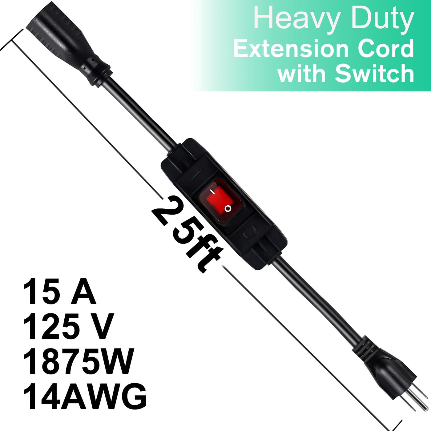 Note: The Switch Is Waterproof. If You Need To Use It Outdoors And Need Waterproofing, It Is Recommended That You Additionally Purchase ''Outdoor Plug Cover Weatherproof '' To Keep Cord Connections Secure And Protected From The Elements Like Water, Snow, Rain, Dust, And Dirt To Ensure Circuit Safety ( Note: It Is Just Water-Resistant. Do Not Submerse It In Water). Outdoor Extension Cord With On/Off Waterproof Switch 3 Prong Extension Cord With One Key Control Switch Is About 25 Ft In Length Versatile Cord Ul Certified Outdoor Extension Cord, Safe And Stable, Heavy Duty Extension Cord With Switch Is Strong Enough To Last A Lifetime. Extension Cord With On/Off Switch Waterproof Specification: Connectors: Nema 5-15P / Nema 5-15R Rated Current:15 A Rated Voltage:125 V Rated Power:1875 W Length:25 Ft Wire:14 Awg Cord Type:Sjtw Wide Range Of Use: The 25 Ft Extension Cord With Switch On/Off For Extending Outdoor Switch Power When You Need It Most,Which Is Suitable For Lamps, Holiday Lights, Outdoor Christmas Lights,Deck Lights, Outdoor Lights, Outdoor Edison Bulb String Lights, Pump, Patio Fountain, Rv Fans And Many Other Standard Electrical Equipment, Suitable For Outdoor, Indoor, Office, Workshop Or Garage.