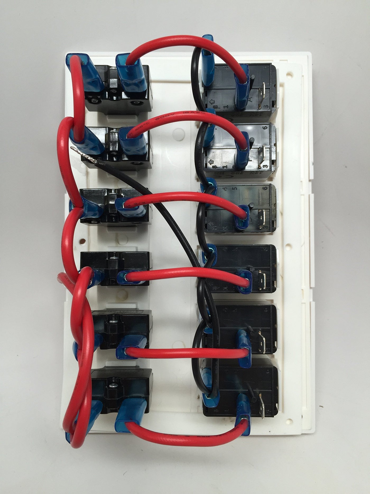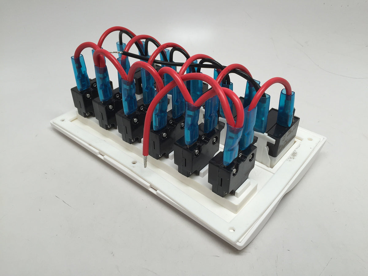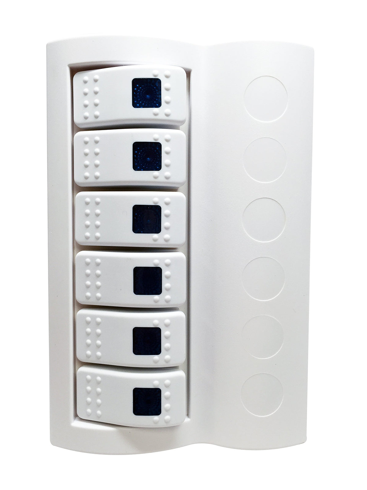 This Is A 6 Gang Splashproof White Switch Panel Made Of Uv Stabilized Plastic. Each Switch Comes With Led Indicator And They Are Ul Approved. | 40 Preprinted Labels Will Be Provided. | This Panel Can Be Mounted Vertically Or Horizontally. Switch Is Waterproof To A Rating Of Ip66. | Led Color: Blue, Dimensions: 7.5'' By 4.75''. Cutout 6 1/4'' By 3 3/4''. | 2 X 5A, 2 X 10A, 2 X 15A Circuit Breaker. Runs At 12 Vdc.