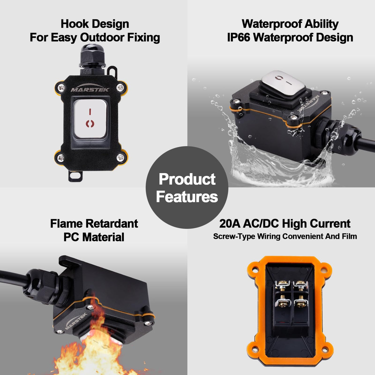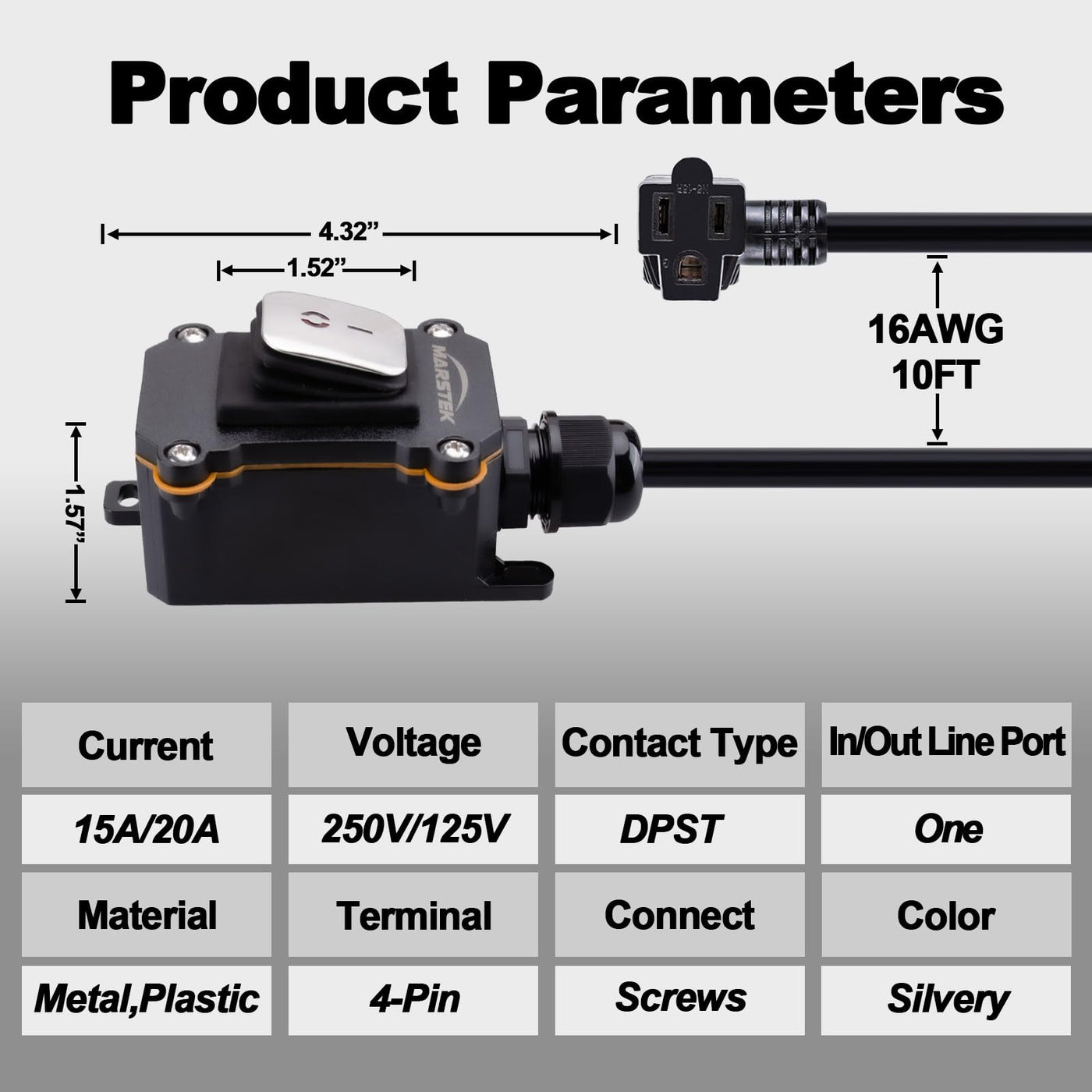 Marstek Heavy Duty Waterproof Extension Cord With On/Off Switch,Inline Cord Switch With 3 Ft 16Awg Cable Piggyback Plug(3 Pronge