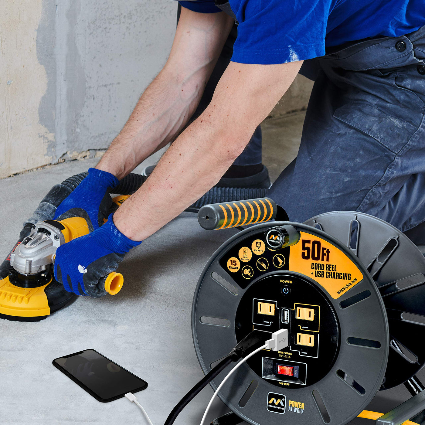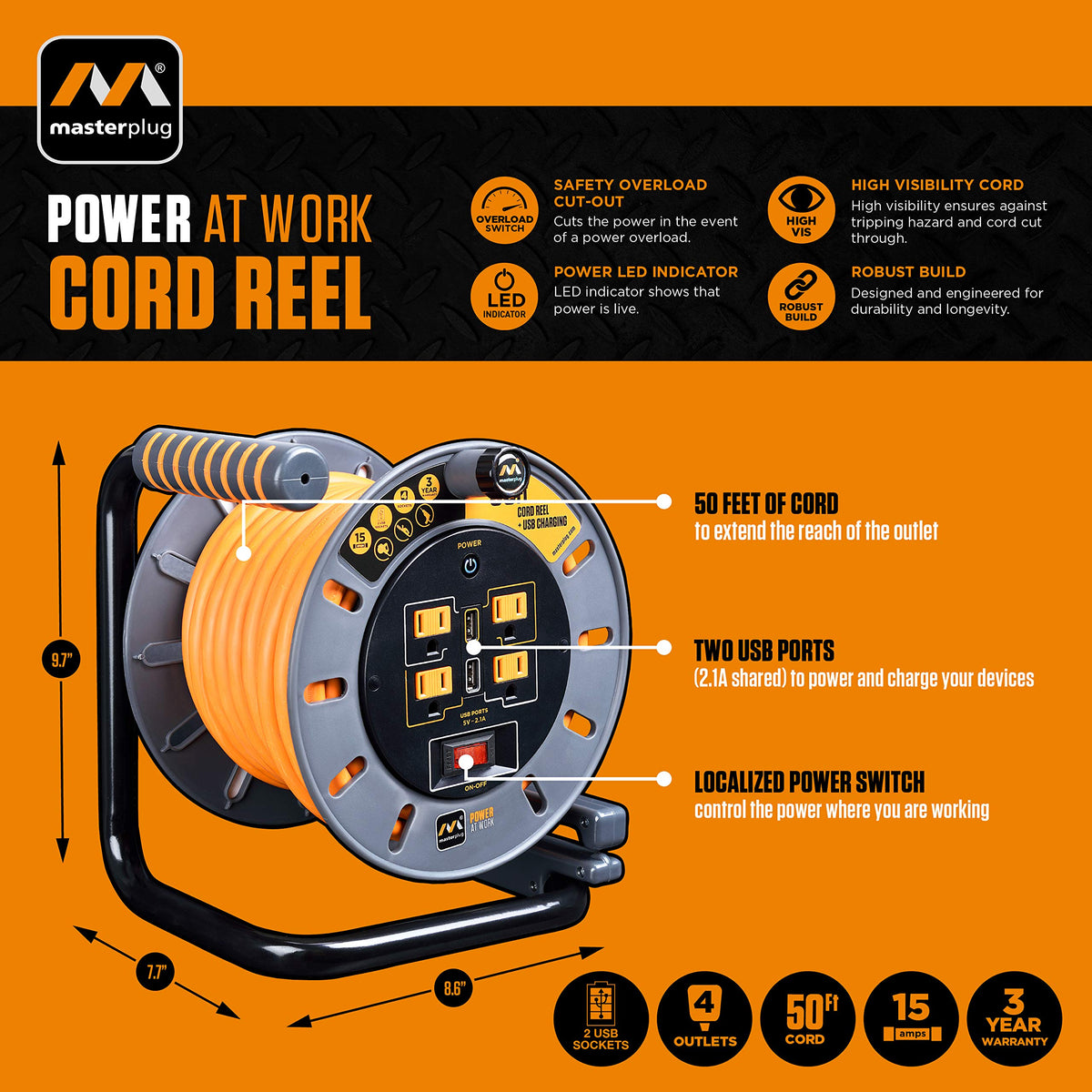 Q: What is the maximum power capacity of the Masterplug 50ft Cord Reel?A: The Masterplug 50ft Cord Reel can handle up to 15 amps, making it suitable for various household and commercial applications.