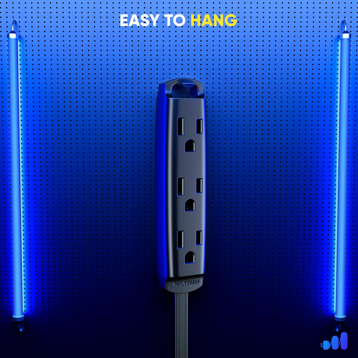 Maximm 6 Ft Black 360 Rotating Flat Plug Extension Cord With 3 Outlets On One Side, Space Saving Design For Compact Areas, Home
