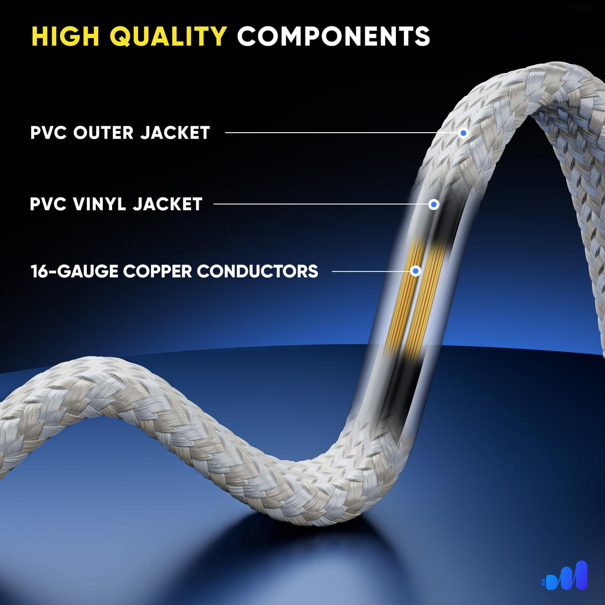 Q: What is the length of the Maximm extension cord and its material?A: The Maximm extension cord measures 10 feet in length and is made from high-quality braided copper wire, ensuring durability and efficient power delivery for your devices.