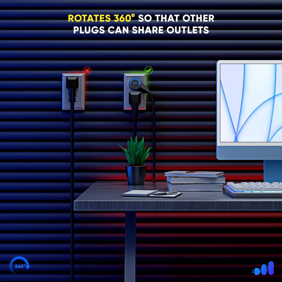 Q: How does the 360° rotating plug feature work?A: The 360° rotating plug allows you to adjust the cord's direction, enabling you to use the outlet without blocking adjacent ones, making it ideal for tight spaces.