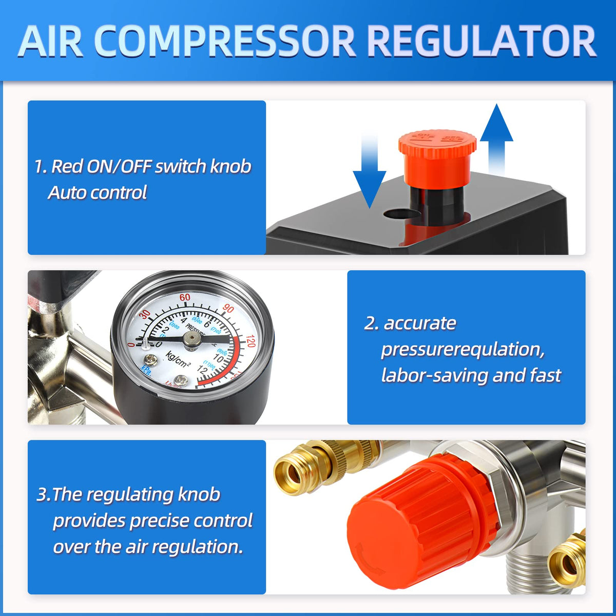 Specifications: Material: Plastic+Metal Color : Red, Black Maximum Pressure: 90-120 Psi Voltage Range:110V-240V Design Concept: Auto Control, Save Electric Energy Of The Air Compressor. Feature: ?High Strength And Long Service Life. ?Save Electric Energy Of The Air Compressor. ?Thread Is Clear, No Burr On The Surface. ?Easy To Disassemble And Install. Package Included: 1X Air Compressor Switch Control Valve 1X Manifold Regulator 1X Safety Pressure Relief Valve 2X Thread Pipe Plug 1X Hex Wrench 1X Teflon Tape