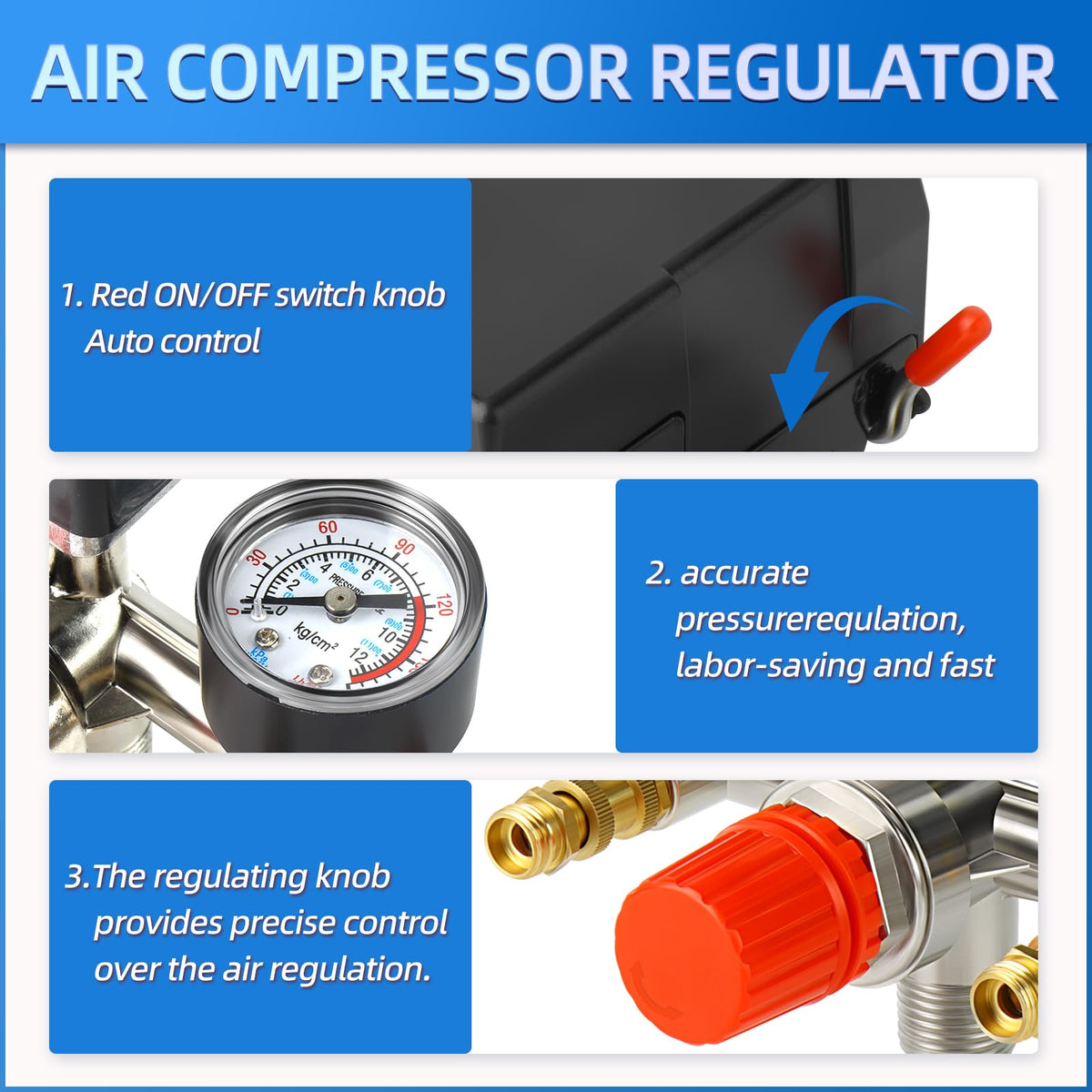 Specifications: Material: Plastic+Metal Color : Red, Black Maximum Pressure: 95-125 Psi Voltage Range: 110V-240V Design Concept: Auto Control, Save Electric Energy Of The Air Compressor. Feature: ?High Strength And Long Service Life. ?Save Electric Energy Of The Air Compressor. ?Thread Is Clear, No Burr On The Surface. ?Easy To Disassemble And Install. Package Included: 1 X Air Compressor Switch Control Valve 2 X Pressure Gauge 1 X Manifold Regulator 1 X Safety Pressure Relief Valve 2 X Thread Pipe Plug 1 X Hex Wrench 1 X Teflon Tape
