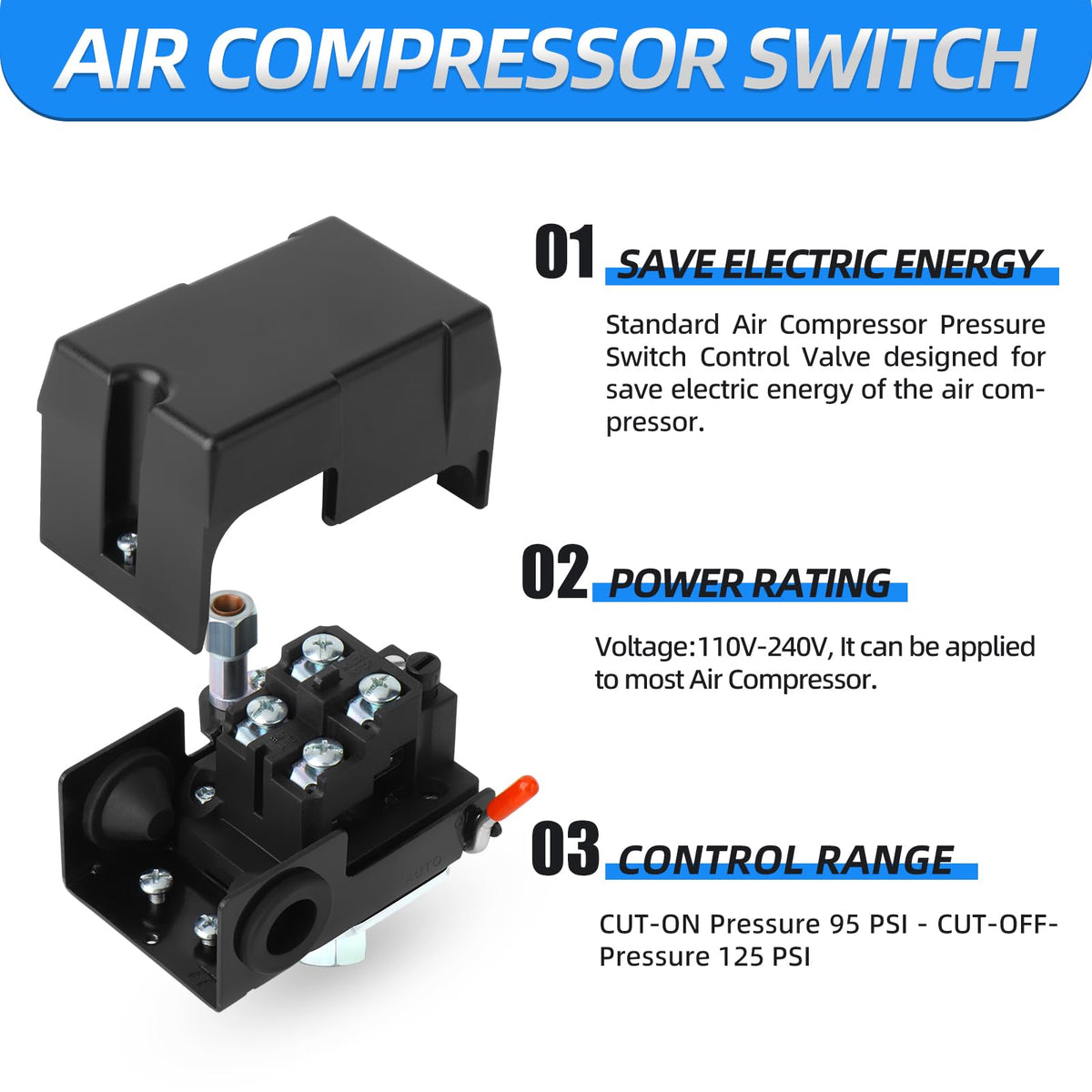 Q: Is the MEANLIN Air Compressor Pressure Switch compatible with all air compressors?A: This pressure switch is designed for standard air compressors that operate within the 110V-240V voltage range and require a pressure setting between 95-125 PSI.