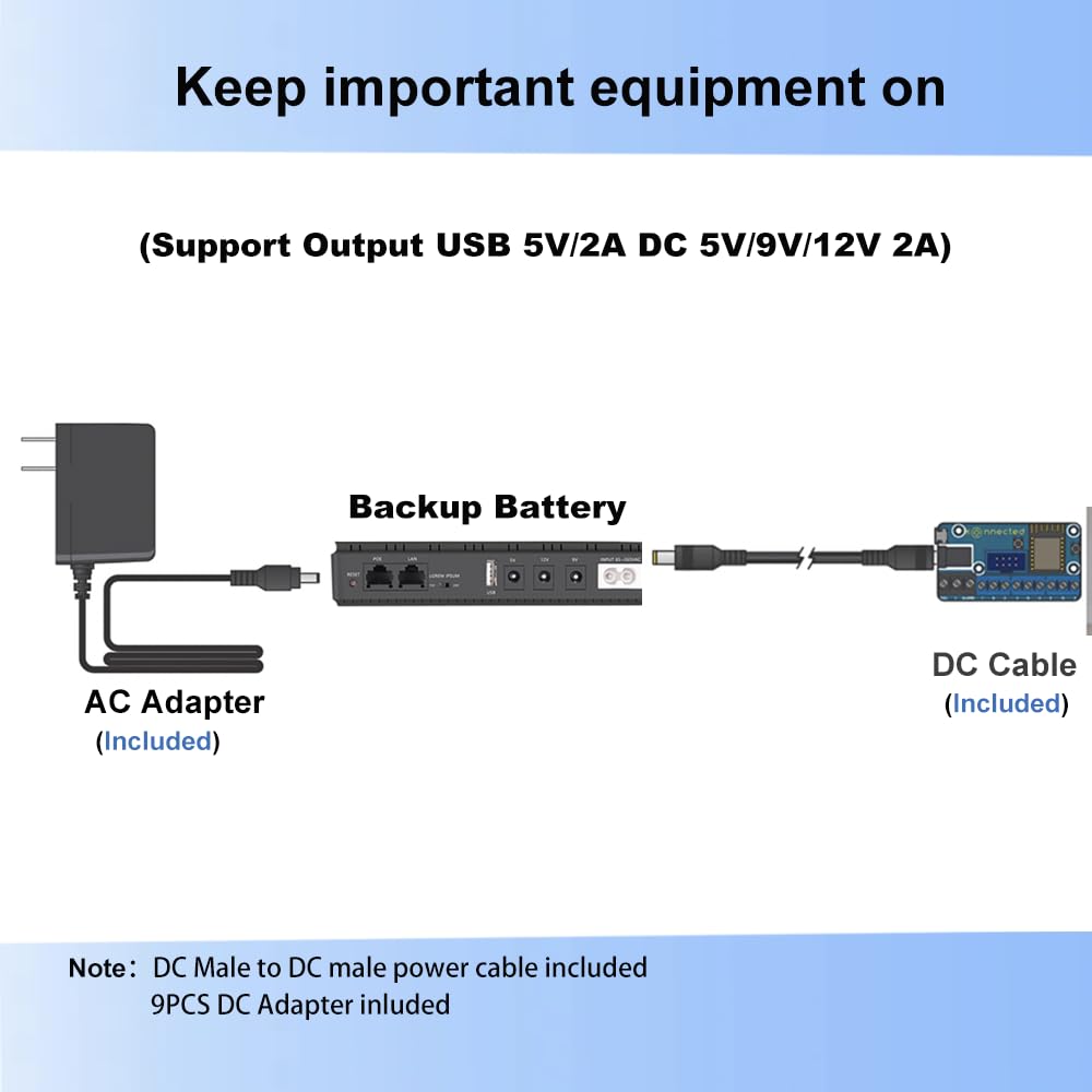 Q: Is the Mini UPS easy to set up for multiple devices?A: Yes, the Mini UPS is designed for seamless setup and supports multiple devices. It comes with 9 different-size connectors, allowing you to easily connect various devices and ensure they receive the appropriate power supply during an outage.