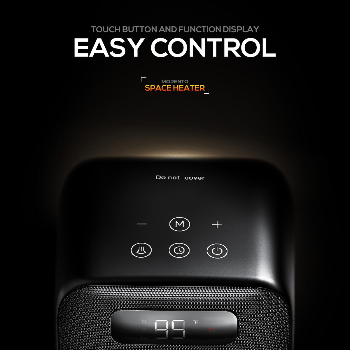 Q: How does the ECO mode work on the MORENTO Space Heater?A: The ECO mode on the MORENTO Space Heater optimizes energy use by automatically adjusting the heating power based on the difference between the set temperature and the ambient temperature, ensuring comfort while saving energy.