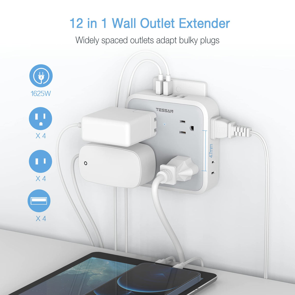 Multi Plug Outlet Extender, Tessan Multiple Outlet Splitter With 4 Usb Wall Charger, Widely Spaced 8 Electrical Plug Expander Su