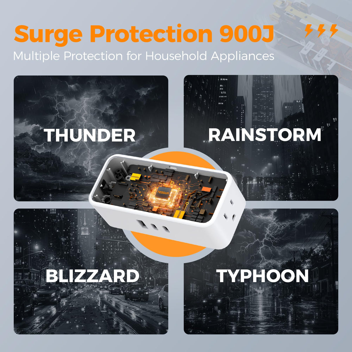 Q: What safety features does the TESSAN Multi Plug Outlet include?A: This outlet splitter includes 900 Joules of surge protection, safeguarding your devices from power surges and spikes, ensuring a safe charging environment.