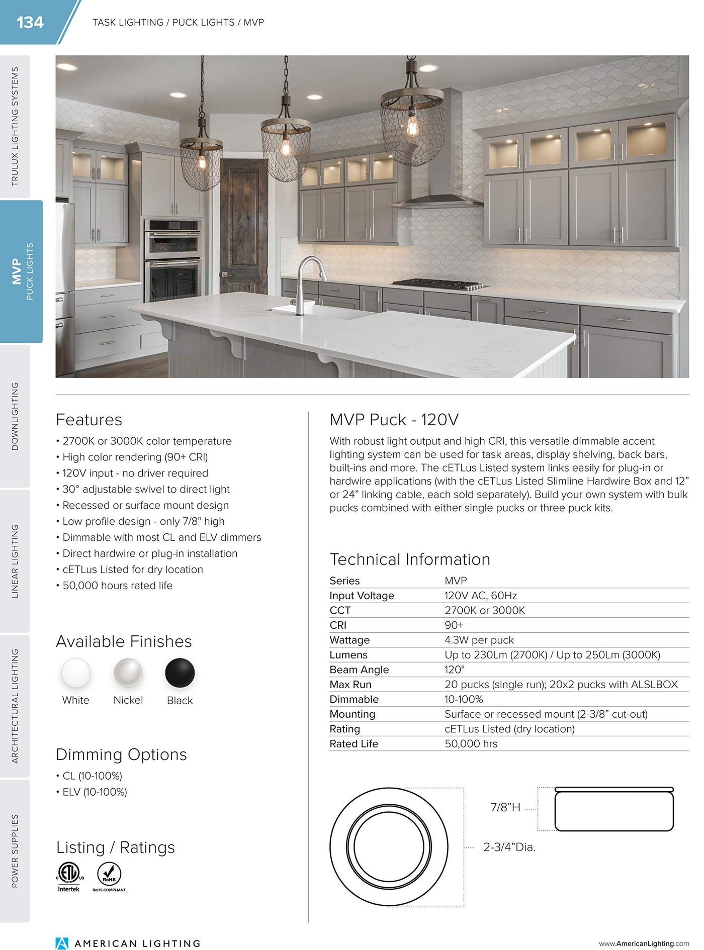New High Performing, Easy To Install Puck Lights Have A Swivel Feature Offering Over 200 Lumens Per Puck Without The Need For A Driver! Mvp Puck Lights Are Designed For Versatility - Choose Between Recess Or Surface Mounting! Kit Includes; (1) 6-Foot Power Cord With Roll Switch, (1) Puck With A 6-Inch Lead Wire And Mounting Screws. Soft And Warm White Leds (2700K/3000K) Color Temperatures Available With 90Cri Mimic Incandescent, Using Only 4-Watts Each Versus 20-Watts! Each Puck Delivers Over 200 Lumens - Over Twice As Bright As Xenon Or Halogen Puck Lights. Pucks Are Dimmable With Most Cfl/Led And Low Voltage Electronic Dimmers (10-100% Light Control). Construction: Zinc Alloy Light Housing With Aluminum Heat Sink. Spring Steel Clips Secure Housing Into Surface Collar With A Snap-Fit, And Retain Recessed Pucks Securely In Place. Polycarbonate Lens Diffuses Light. Link Up To 20-Pucks To A Single Power Supple. Adaptable Design Allows Daisy Chain Installation With Or Without Linking Cables Between Pucks. Hardwire Box Can Be Ordered A La Carte, Offering Two 5A Connection Ports For Larger Installations. Plug-In Installations Can Be Controlled By Inline Roll Switch On Power Cord; Hardwire Boxes Are Controlled By Wall Switch Or Dimmer. Founded In 1989, American Lighting, Inc. Manufactures A Wide Range Of Lighting Solutions For Your Residential, Commercial And Specialty Lighting Needs. We Pride Ourselves In Being A Lighting Solutions Provider By Offering Our Customers A Broad Line Of Innovative And High Quality Lighting Products. Continued Innovation Is A Core Strategic Initiative At American Lighting, And We Are Committed To Developing New Products By Utilizing The Latest Lighting Technologies And Designs. We Pledge To Deliver Superior Customer Service By Employing And Training A Team Of Highly Experienced Lighting Professionals.