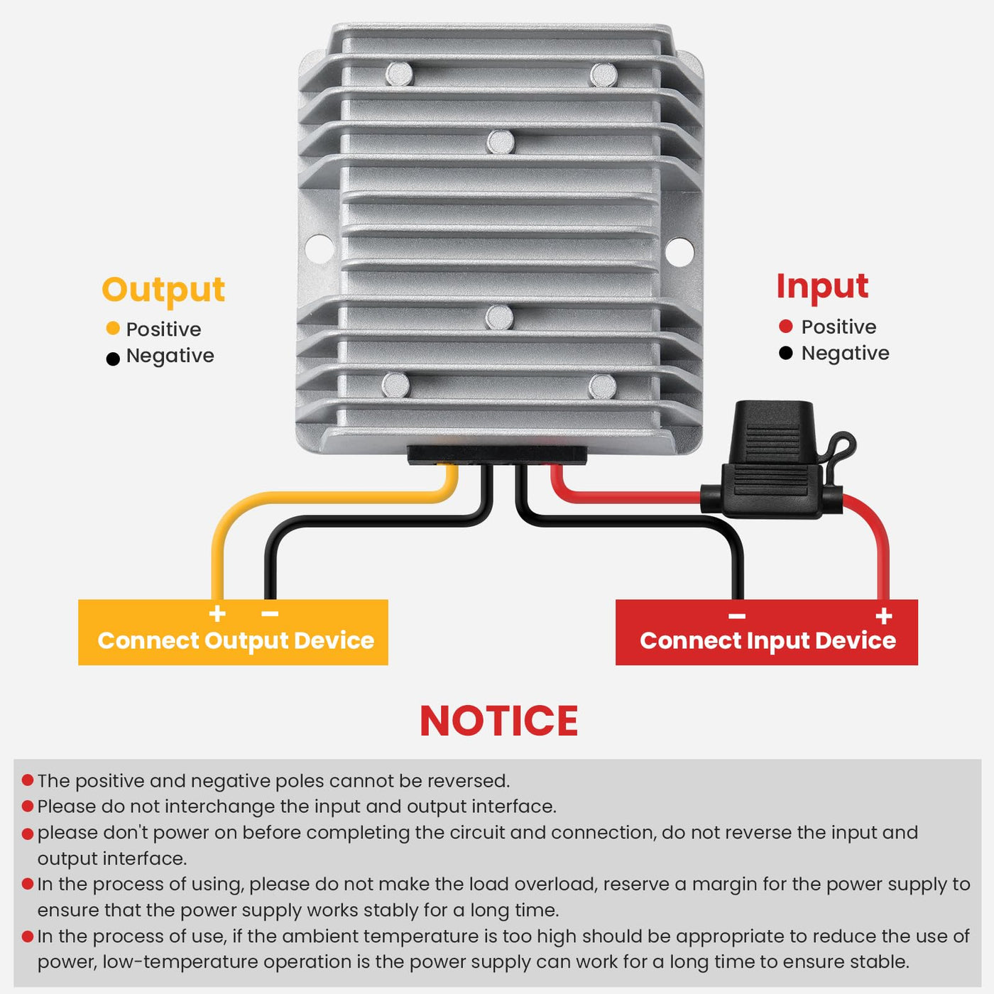 Q: What safety features does this voltage converter have?A: The converter is equipped with multiple safety features including output overcurrent protection, output short circuit protection, input undervoltage protection, and a fuse to prevent damage from high voltage.