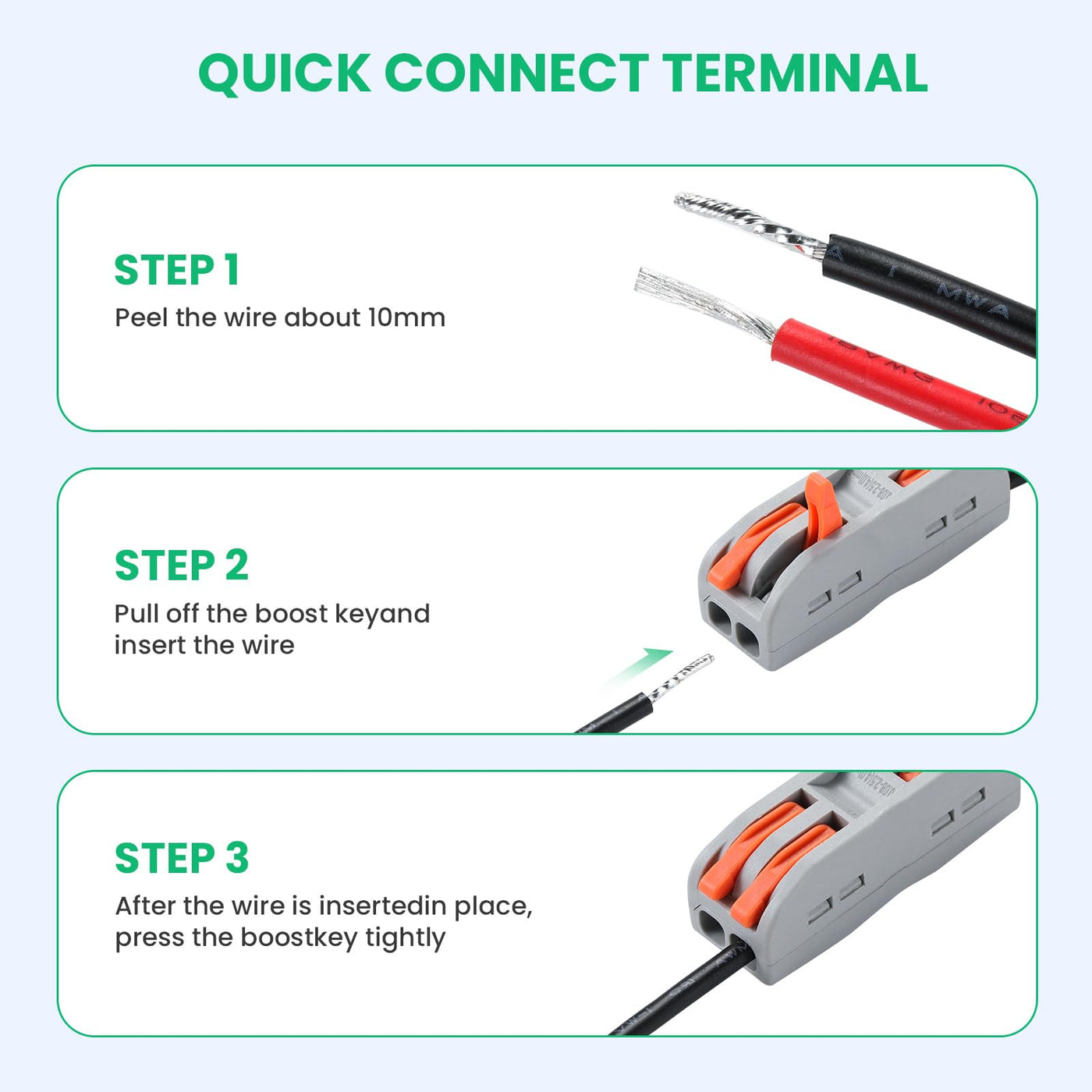 Q: How do I connect the wires to the MZHOU DC/DC converter?A: To connect the wires, first remove approximately 10 mm of insulation from the cable. Insert the cable into the terminal block and press the boost button firmly to secure the connection.