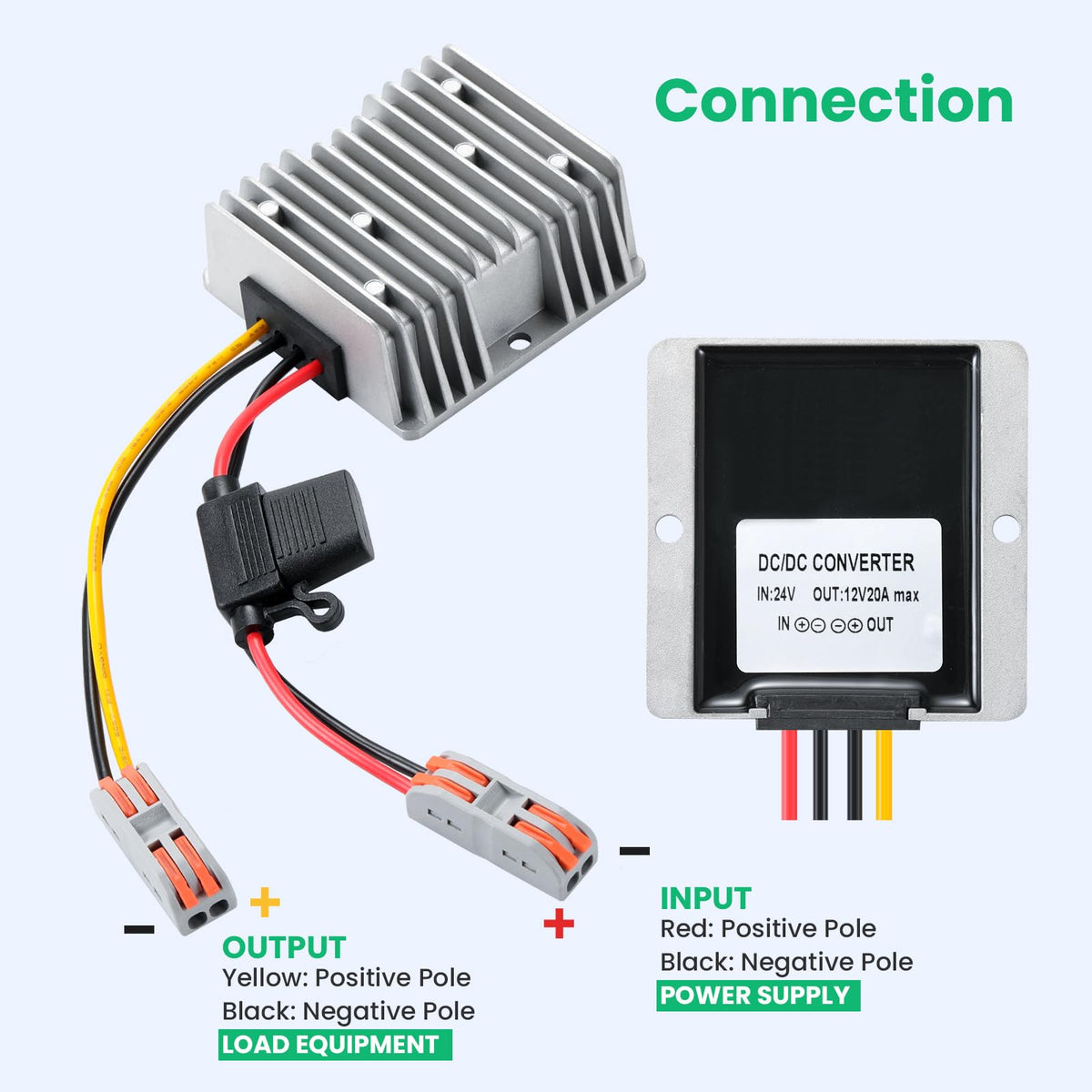 Dc/Dc 24V To 12V/20A Max Voltage Converter Parameters Name:Voltage Reduction Converter Brand: Mzhou Function:Voltage Reduce Typical Input Voltage: 24V Efficiency: Over 90%(When 24V Input) Output Voltage: 12V Dc Line Output Current: 20A Output Power:240W Waterproof Rating: Ipx-7 Working Temperature: -40? ~ +85? Working Humidity: 0~95%Rh Storage Temperature:-40? ~ +100? Storage Humidity: 0~95%Rh L*W*H: 74*74*32Mm Weight: About 250-260Ginstructions For Connecting The Product Terminals:Step 1: Remove Approx. 10 Mm Of The Cable'S Insulation.Step 2: Remove The Booster Key And Insert The Cable.Step 3: After Inserting The Cable, Press The Boost Button Firmly.Dc-Buck Converter Safety Manual1. The Load Connected To The Output Of The Power Controller Should Not Be Higher Than The Maximum Load Power; Any Higher Load Will Damage The Power Controller.2. If The Ambient Temperature Is Too High, The Power Should Be Reduced Accordingly. Operation At Low Temperatures Is A Guarantee Of Long-Term Reliable Operation Of The Power Supply Unit.3. Do Not Use The Device Near Heat Sources Such As Fire Or Heaters.4. Do Not Connect The Input Cable To The 220 V Household Power Supply.&Nbsp;5. Do Not Place The Appliance Near Sources Of Ignition Or Heaters. 6.6. The Appliance Must Not Be Dismantled Or Repaired By Non-Professionals.&Nbsp;7.The Input Voltage Must Not Exceed The Fluctuation Range Of The Converter.&Nbsp;8.The Output Power Of The Converter Must Be Greater Than The Power Required By The Connected Devices.9.The Positive And Negative Leads Must Not Be Reversed. Package Includes 1X Dc To Dc Voltage Down Transformer