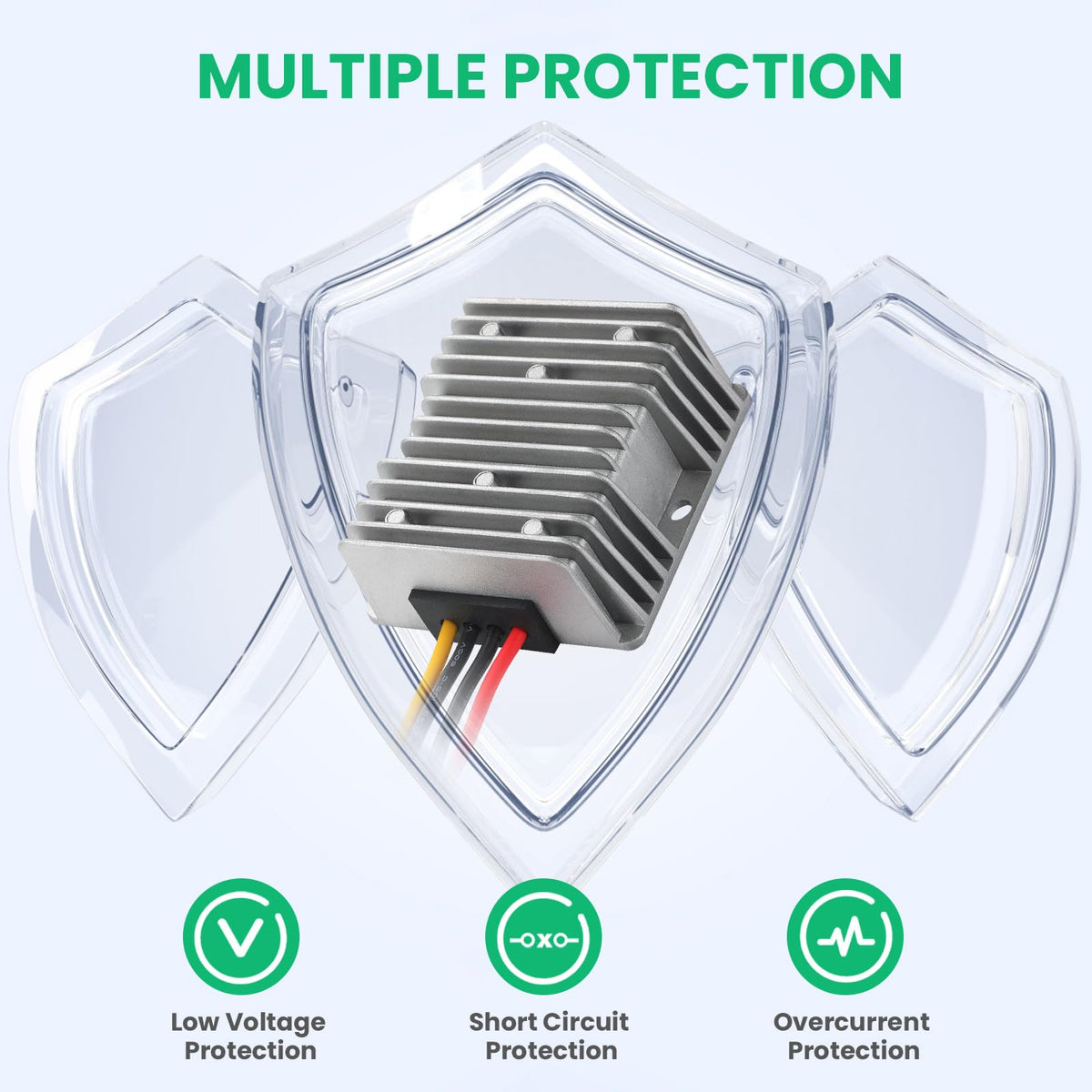 Q: Can this converter be used in outdoor environments?A: Yes, the MZHOU DC/DC converter has an IPX-7 waterproof rating, which means it is designed to withstand heavy rain and can be safely used in outdoor environments.
