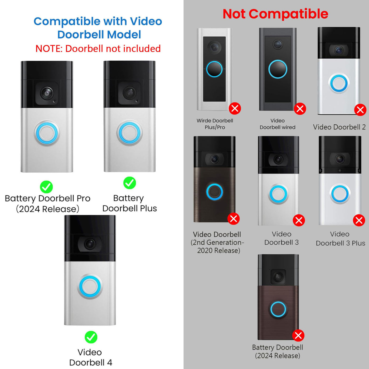 Q: What doorbell models are compatible with the AHBTEYM No-Drill Adhesive Doorbell Mount?A: The AHBTEYM No-Drill Adhesive Doorbell Mount is compatible with Ring Video Doorbell 4, Battery Doorbell Plus, and Battery Doorbell Pro. It is not compatible with Video Doorbell 2, 3, 3 Plus, or any other brands.