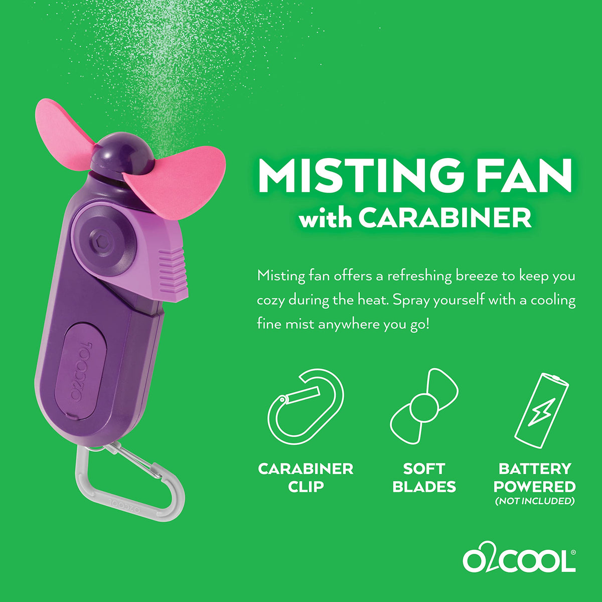 Stay Perfectly Cool: The O2Cool Mini Misting Fan Offers A Refreshing Breeze To Keep You Cozy During The Heat. Fill It Up With Water And Spray Yourself With A Cooling Fine Mist Anywhere You Go! | On-The-Go Comfort: With The Included Carabiner You Clip Your Fan To Anything! Clip It To Your Bag Or Belt. A Super Compact Design Makes It Compact And Convenient. Carry It In Your Purse Or Pocket. | Compact Powerful One-Speed Motor: A Powerful Motor And Patented Design Works Together To Provide Fresh Cooling Air Anywhere! It