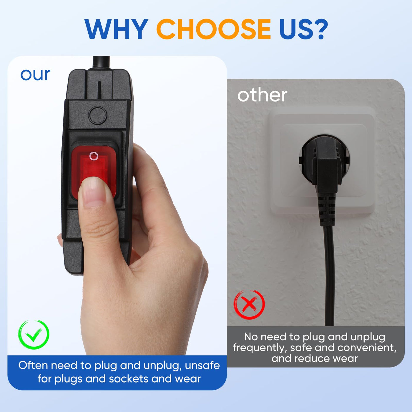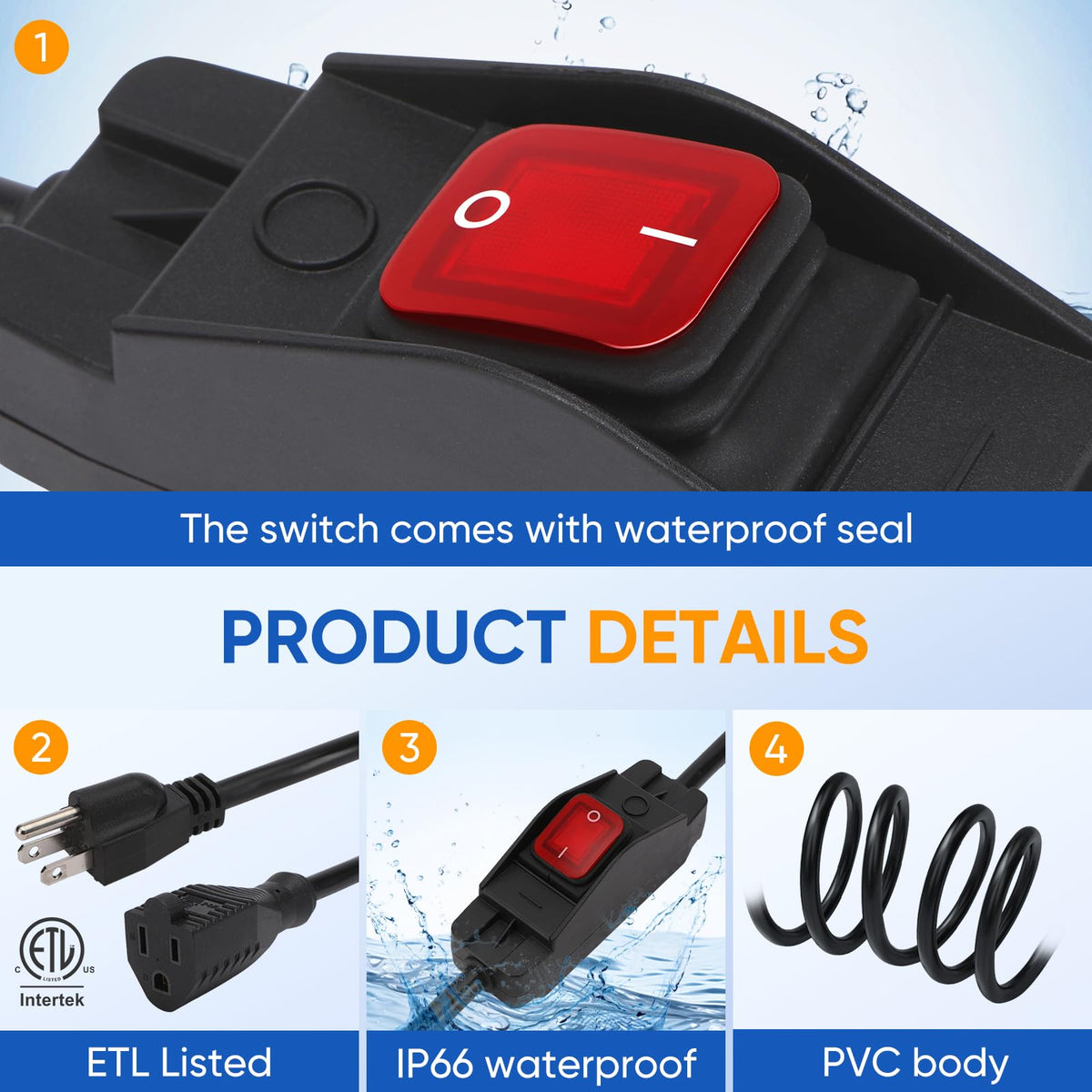Q: Is the outdoor extension cord safe for use in wet conditions?A: Yes, this outdoor extension cord features a waterproof on/off switch which enhances its safety in wet conditions. However, for added protection, we recommend using a weatherproof cover for the cord connections.
