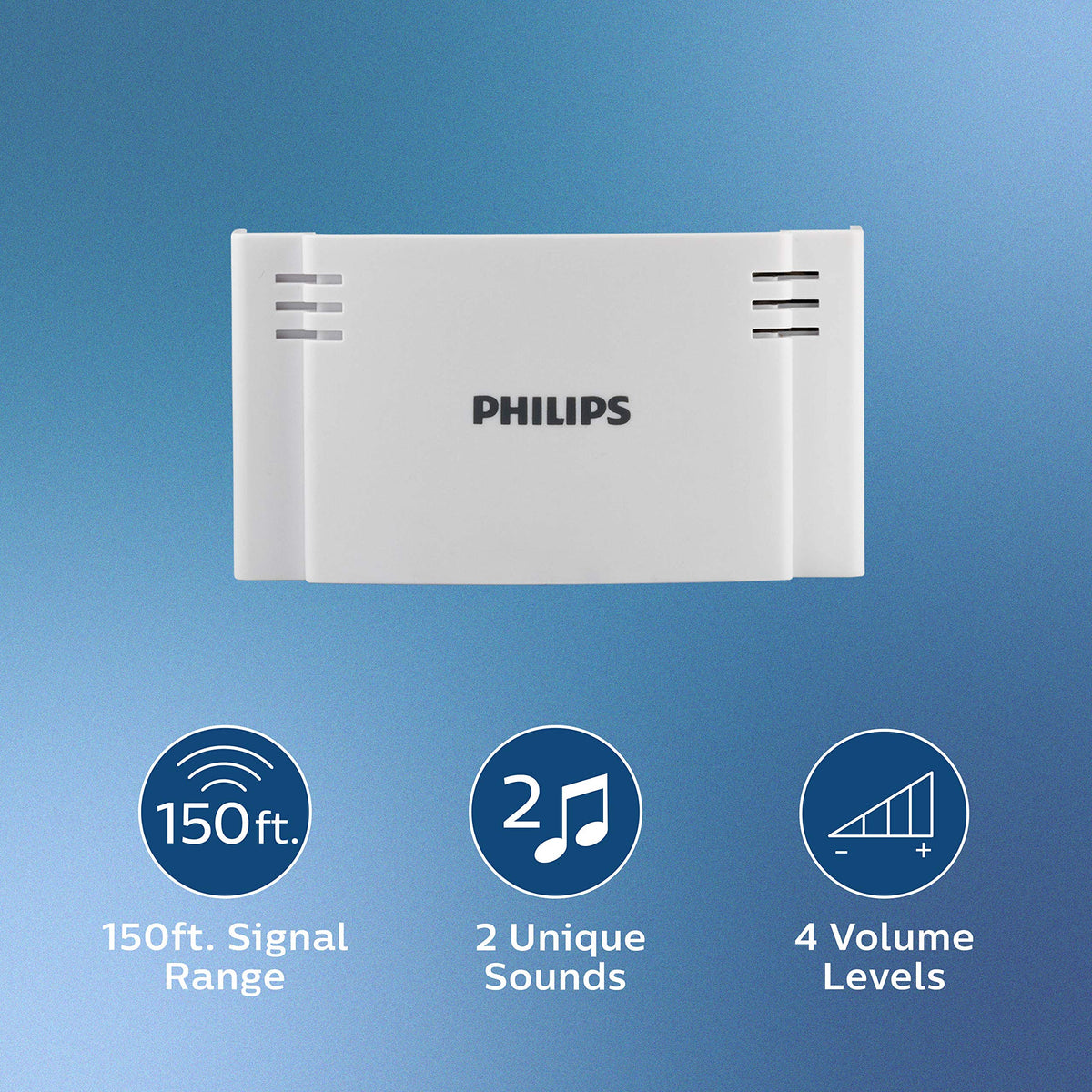 Enhance Your Entryway With A Philips Battery-Operated 2-Melody Doorbell Kit. Included In This Doorbell Kit Are One Battery-Operated Receiver (150Ft. Range) And One Push Button With Cr2032 Battery And Mounting Hardware. The Battery-Operated Doorbell Pairs With Up To Four Wireless Push Buttons And Features Two Melodies (Ding Dong And Westminster) To Customize Multiple Entryways With Separate Sounds. For Additional Personalization, Adjust The Sound Level Using Four Volume Settings. The Push Button Includes A Cr2032 Battery For Quick And Easy Installation And Comes Already Paired With The Receiver. Mounting Instructions Are Included For Both The Push Button And Receiver, Which Operates Using Three Aa Batteries (Not Included). The Wireless Setup, Provided Mounting Hardware And Up To A 150Ft. Range Make Installation Of The Doorbell Kit A Breeze. The White Finish Allows The Doorbell And Button To Integrate Into Any D?Or. With A Philips Battery-Operated 2-Melody Doorbell Kit, You?L Never Miss A Guest.