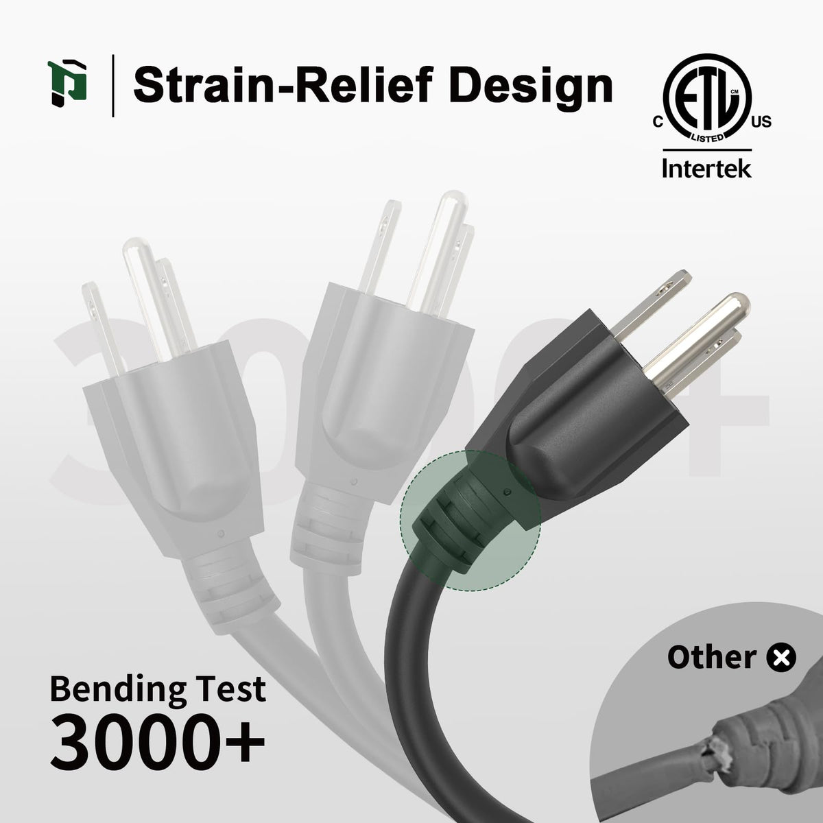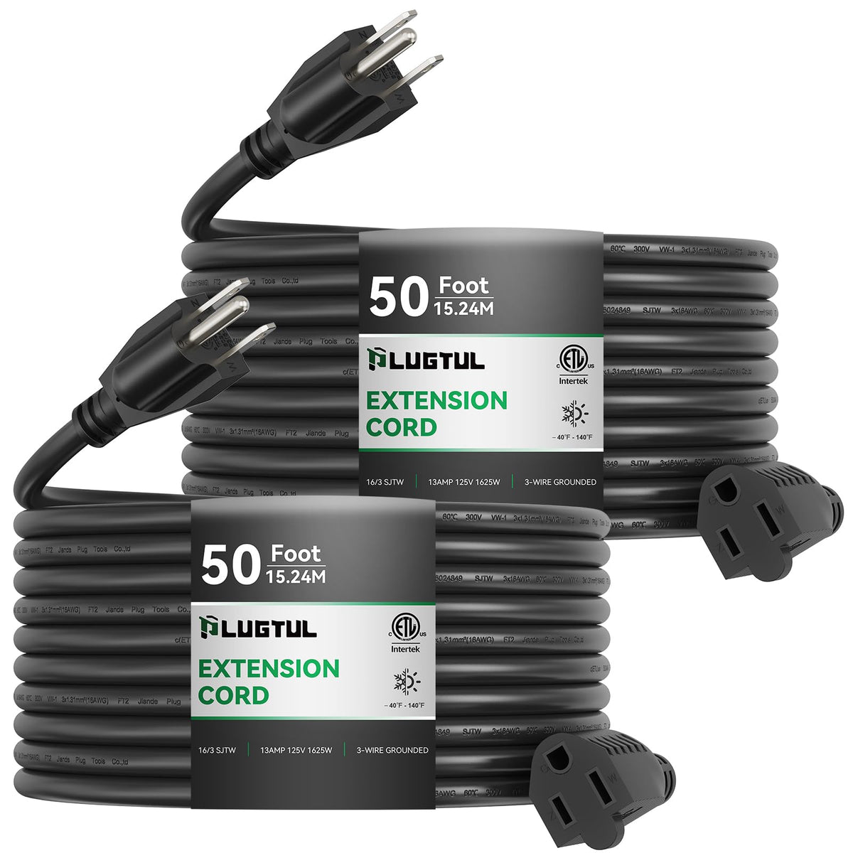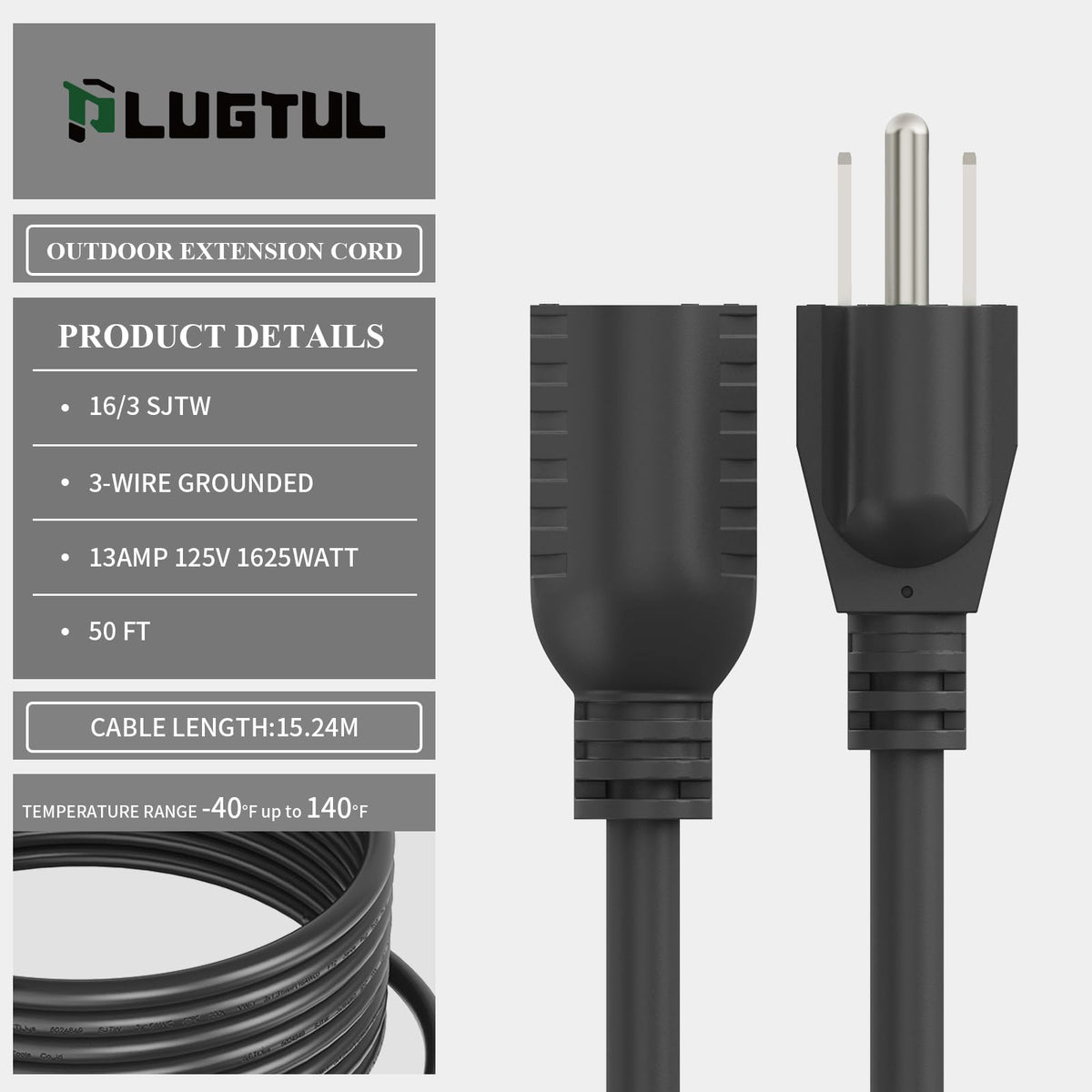 Plugtul Black Outdoor Extension Cord 50Ft, 16/3 Gauge Power Cord Heavy Duty Extension Cord Our Black Extension Cord Is Made With 16 Gauge Wire Diameters Which Can Handle More Amperage, And Therefore More Wattage. Maximum Output Power Is 1625 Watts(13 Amps, 125V). Durable & Flexible Waterproof Flexible Vinyl Jacket Provides Have Better Bending Resistance And Prevent Them From Breaking During Long-Term Bending And Pulling. Temperature Range: -40?F To +140?F. Robust And Flexible With Reinforced Nickel-Plated Brass Blades To Prevent Bending Or Accidental Breakage And Are Corrosion Resistant. The Flexible Cord Bends Well To Suit A Variety Of Situations. Variety Of Applications All Purpose Extension Cord For Indoor And Outdoor Use. Ideal For Use With Heavy Duty Power Tools, Appliances And Any Other Device That Requires Extended Use. What You Get 2*50Ft Outdoor Extension Cord. If You Have Any Problem With Our Extension Cord When You Received Or After Using, Please Contact Us By Email, We Will Reply To You In 24Hours And Will Do Our Best To Help You Solve The Problem.