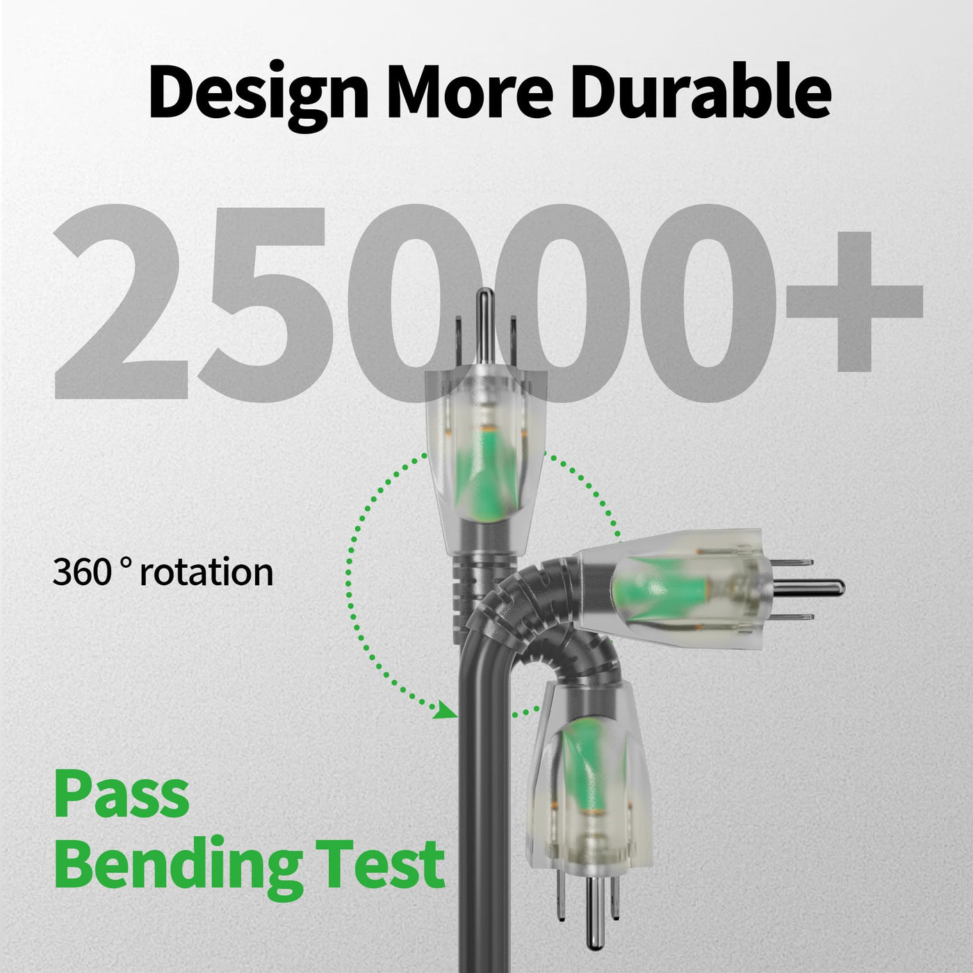 Extra Heavy Duty: Black Outdoor Extension Cord Waterproof 100Ft 10 Gauge, 15 Amp, 125 Volts, 1875Watts, Male Power Plug Nema 5-15P, Female Power Socket Nema 5-15R, Sjtw Power Cord; Etl, Cetl Listed, Heavy Duty Extension Cord 100 Ft Is Perfect For Any Heavy Duty Use, Circular Saws, String Lights, Block Heater, Lawn Mowers, Gardening, Landscaping, Construction Site, Welding Work, Or Powering Major Appliances Lighted End & Safe To Use: Led Indicator Lights Up When Long 100 Ft 10 Gauge Extension Cord Outdoor Powered, Bright Pvc Jacket Color Makes This Waterproof Extension Cord For Outside Easily Visible Outdoor And Indoor, Avoid Tripping In Dark Work Environment; Each Exterior Extension Cord 10/3 Passed 1500V High Voltage Test To Keep Your Appliance In Safe Weather-Proof & Flexible: Outdoor Waterproof Extension Cord Jacket Is Wear-Resistant And Durable, 3 Prong 100 Ft Extension Cord Outdoor Is Ip65 Waterproof, Weather-Resistant, Heat-Resistant 158F, Corrosion-Resistant, Flexible Vinyl 100' Extension Cord Will Keep Flexible At -58F And Easy Re-Pack After Using Durable & Strain Relief Design: Appliance Extension Cord Plug And Socket End Have A Strain Relief Design, They Have Undergone More Than 20000 Bending Tests, Even If The Appliance Extension Cord Is Bent At The Maximum Angle, It Will Not Break, So The Service Life Is Extended And The Use Is Safer; The Side Of Plug And Socket Are Designed With Anti-Skid Lines, Which Is Easy To Pull Out Or Insert Reliability: Package Contains 100 Foot Extension Cord And Storage Straps With Carrying Handle, Friendly And Reliable Customer Service Will Respond To You Within 24 Hours; It'S Safer To Peel Off The Storage Straps And Unfold The 10 Gauge Extension Cord 100 Ft Before Using It