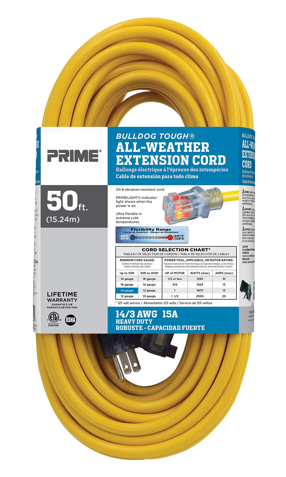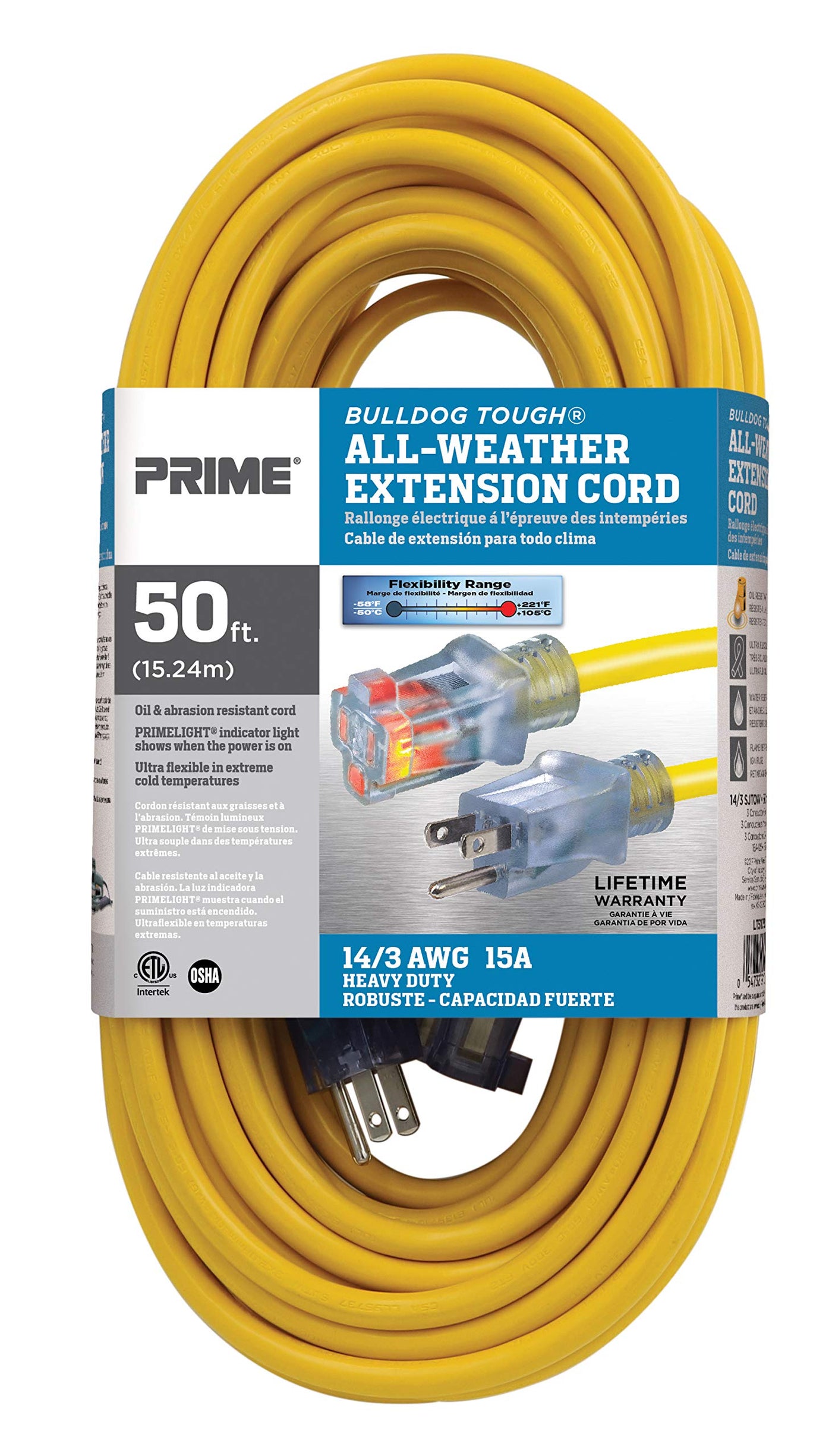From The Manufacturerthe Prime Wire And Cable 50-Feet 14/3 Sjtow Bulldog Tough Extension Cords With The Prime Light Neon Lamp Embedded In The Female Connector To Let You Know When The Power Is On. The Circuit Is Designed So That If The Lamp Fails, It Will Not Affect The Operation Of The Extension Cord. This Is Perfect For Heavy Duty Applications For Contractors And Home Users. They Are Water And Oil Resistant, Flame Retardant, Ultra Flexible, Abrasion Resistant And Nickel-Coated Brass Blades Resist Corrosion. Flexible Temperature Range (-58F - +221F).