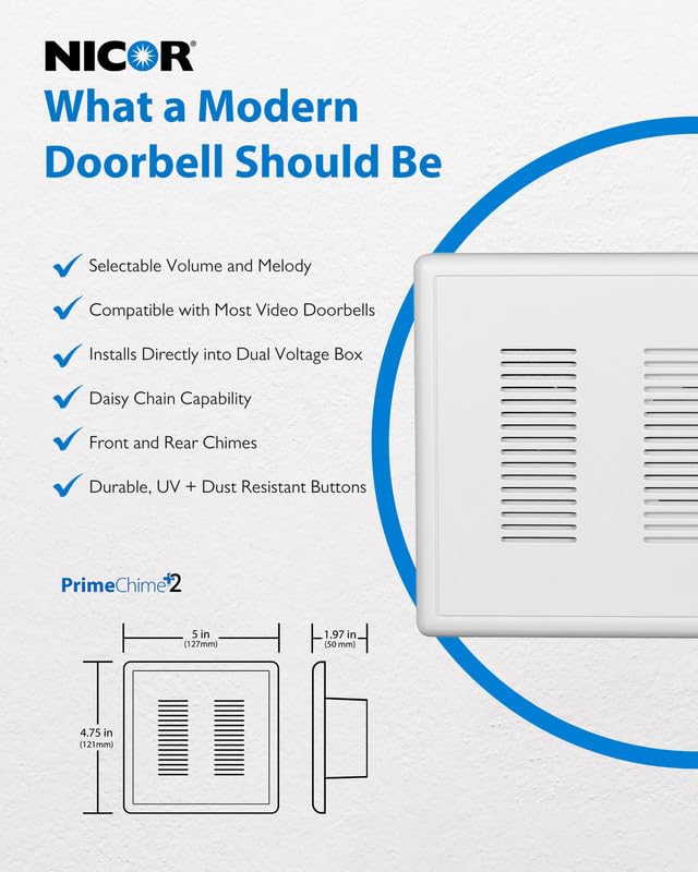 Nicor? New Primechime Plus 2 (Prcp2) Features Expanded Video Doorbell Compatibility (See Compatibility List), Combining Line Voltage And Low Voltage Together Into A Single Unit With A Built-In Transformer. This Makes Installation Clear And Simple. The Recessed Chime Hub Features Five Selectable Chime Tones And Five Selectable Volume Settings For True Customization. The Matte White, Snap-On Faceplate Can Be Painted For A Truly Customized Look To Match Your Home? Interior. The Primechime Plus 2 Can Be Wired To Two Separate Doorways, Each With Their Own Unique Chime Tone, So You Always Know Which Door To Answer. Have More Entrances? Two Units Can Be Linked (Daisy-Chained) Together To Cover Additional Doorways And Provide Extra Sound Coverage In Larger Homes. This Primechime Plus 2 Kit Includes One Decorative Button And Two Standard Push-Buttons (All Illuminated). Additional Decorative And Stucco Buttons Are Also Available In A Variety Of Colors To Match Your Home? Exterior. This Kit Includes Mounting Hardware, Installation Instructions, And A 1-Year Warranty.