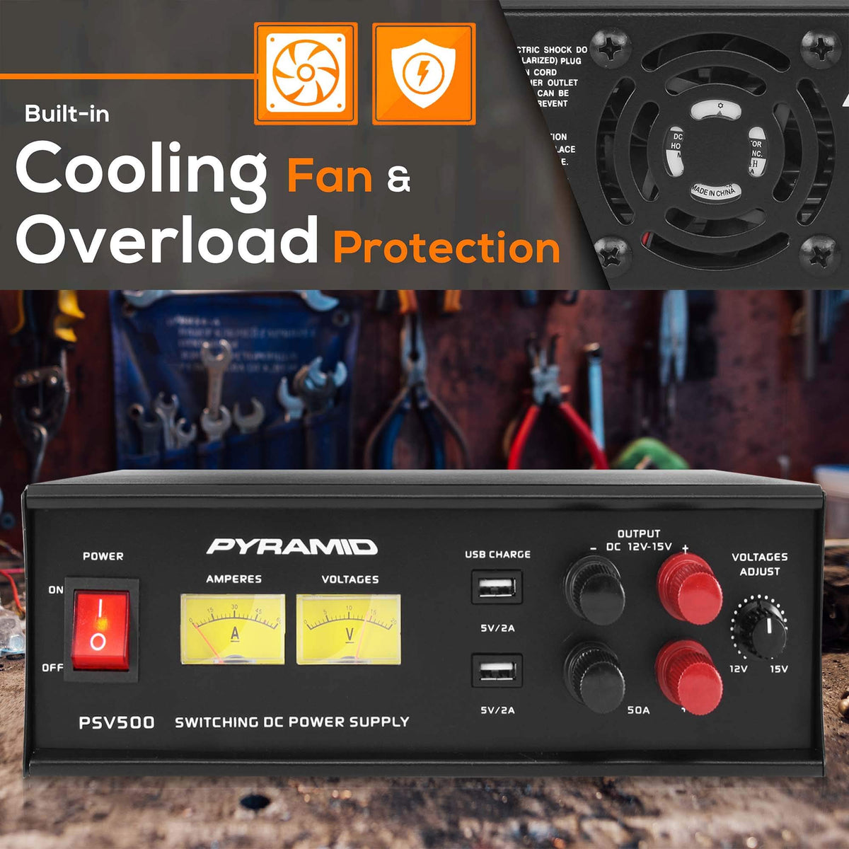 Pyramid Psv500 Universal Compact 50 Amp Adjustable 12 To 15 Volts Output Home Bench Power Converter Supply, With 2 Usb Ports And